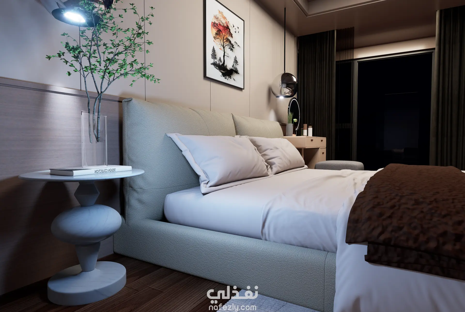 يجمع تصميم غرفة النوم هذه بين البساطة العصرية والأجواء الدافئة والترحيبية. تخلق درجات اللون البيج الهادئة والخطوط الانسيابية والمواد الراقية بيئة هادئة وفاخرة مثالية للاسترخاء. تُبرز الإضاءة الخافتة الأثاث الأنيق والخامات المميزة، من السرير المنجد إلى الأرضيات الخشبية الناعمة، بينما تسمح النافذة الكبيرة بدخول وهج غروب الشمس اللطيف، مضيفةً لمسة شاعرية إلى المكان. تم اختيار كل عنصر بعناية فائقة لتحقيق التوازن بين الراحة والرقي، مما يوفر تناغمًا مثاليًا بين العملية والجمال.