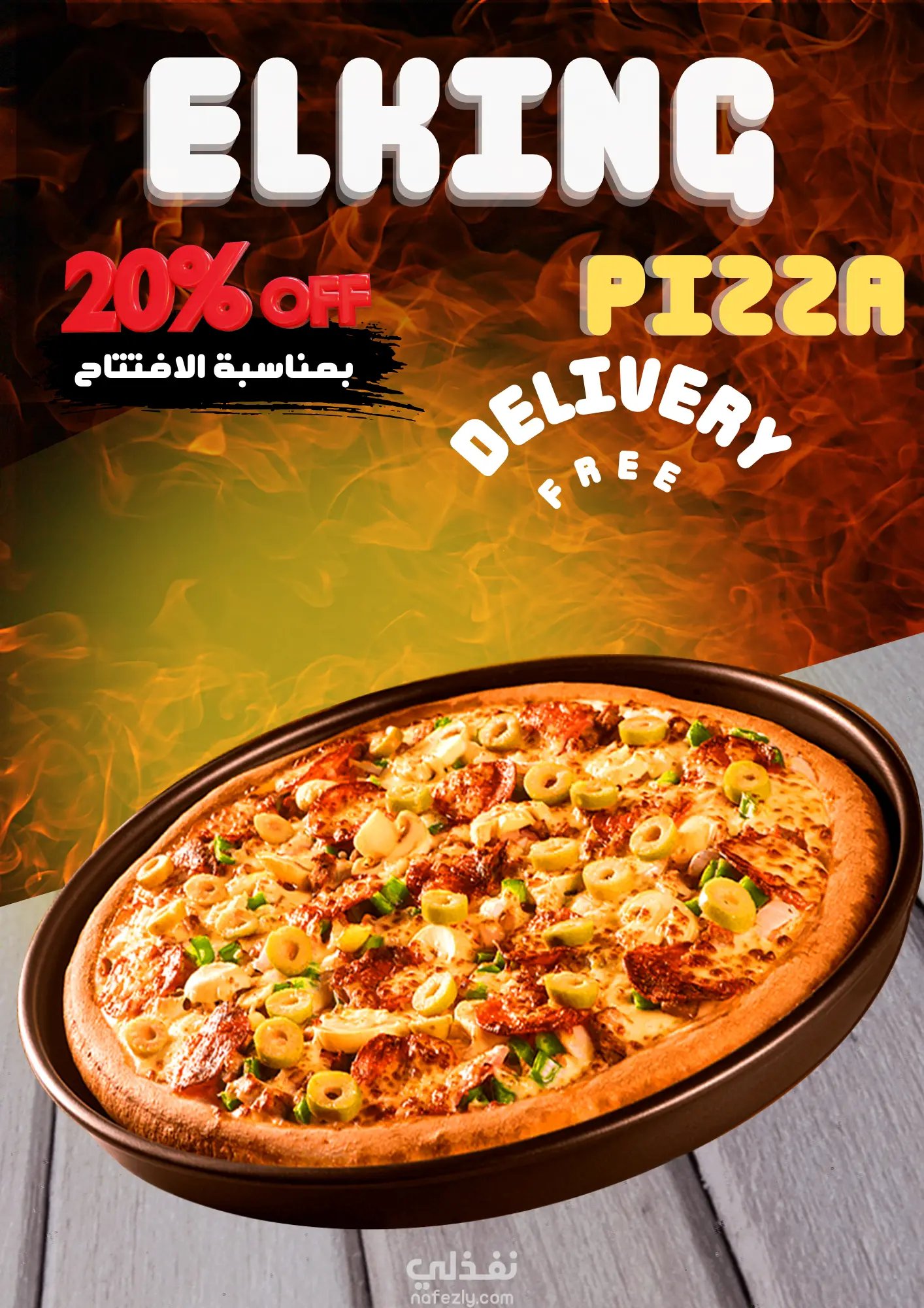 صمّم إعلان احترافي لمطعم بيتزا باسم EL KING PIZZA بخط ثلاثي الأبعاد أبيض أضف عرض “20% خصم بمناسبة الافتتاح وعبارة توصيل مجاني مع صورة بيتزا شهية واقعية مع الجبن والزيتون التصميم يكون احترافي ويصلح للسوشيال ميديا والطباعة.