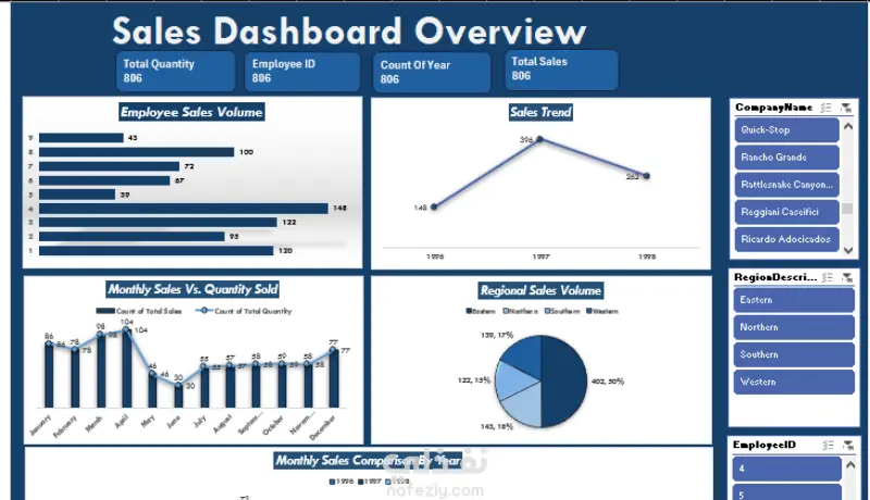 صممت لوحة تحكم تفاعلية للمبيعات (Sales Dashboard Overview) باستخدام Excel لتحليل بيانات المبيعات بطريقة ديناميكية وبصرية. تتضمن اللوحة: تحليل مبيعات الموظفين (Employee Sales Volume) لمقارنة أداء كل موظف. اتجاهات المبيعات السنوية (Sales Trend) لمتابعة تطور الأداء عبر السنوات. مقارنة المبيعات الشهرية حسب الكمية والمبيعات (Monthly Sales vs. Quantity Sold). تحليل المبيعات حسب المناطق (Regional Sales Volume) باستخدام المخططات الدائرية. فلاتر تفاعلية لتصفية البيانات حسب اسم الشركة، المنطقة، أو رقم الموظف. الهدف من المشروع هو تقديم رؤية شاملة وواضحة عن أداء المبيعات تساعد الإدارة على تتبع النتائج وتحديد الاتجاهات وتحسين الاستراتيجيات البيعية.