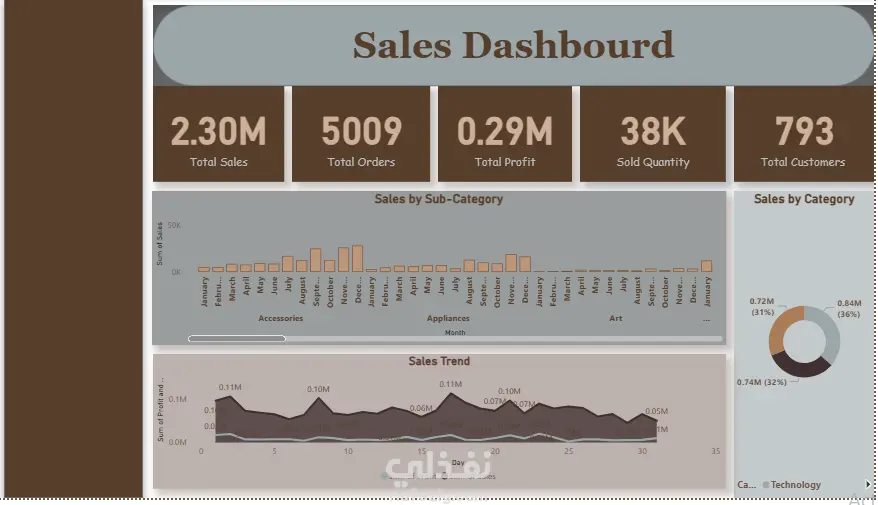 مؤشرات الأداء الرئيسية (KPIs): إجمالي المبيعات، الأرباح، عدد الطلبات، الكمية المباعة، وعدد العملاء.