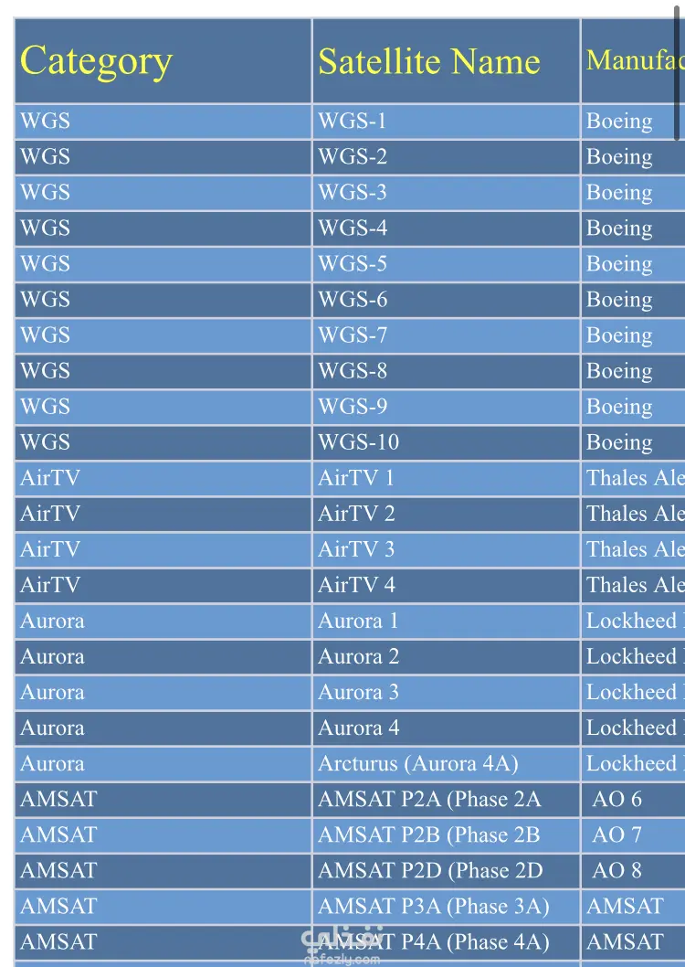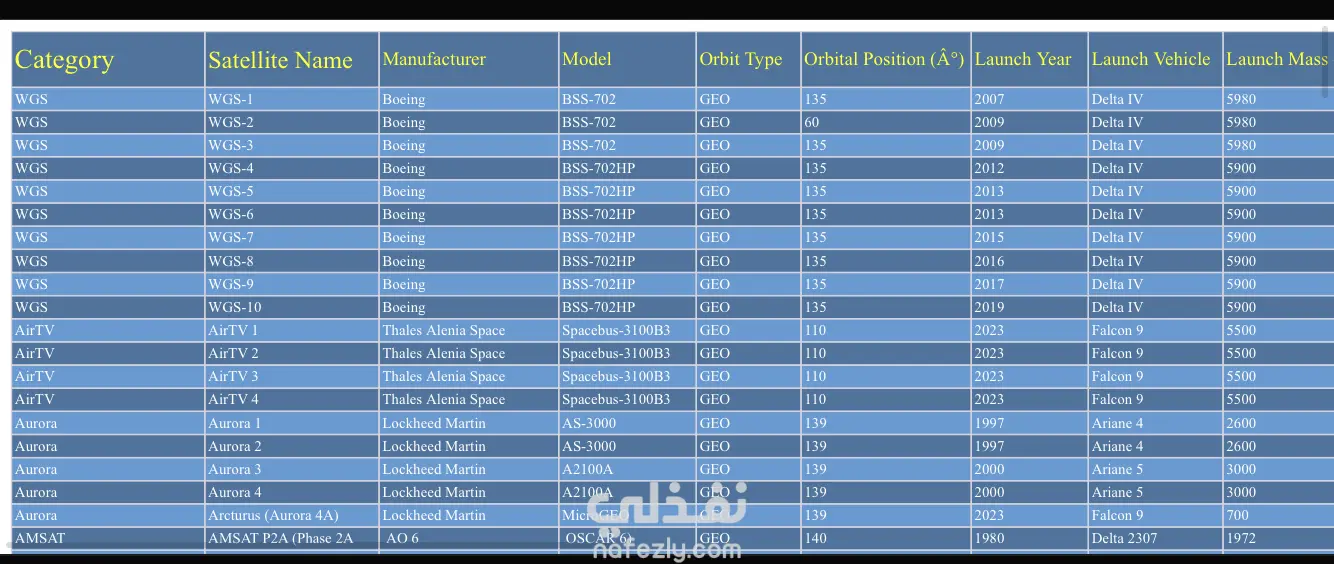 جدول excel احترافي يحمل بيانات مصنفه للاقمار الصناعيه الامريكيه الخاصه بالتواصل