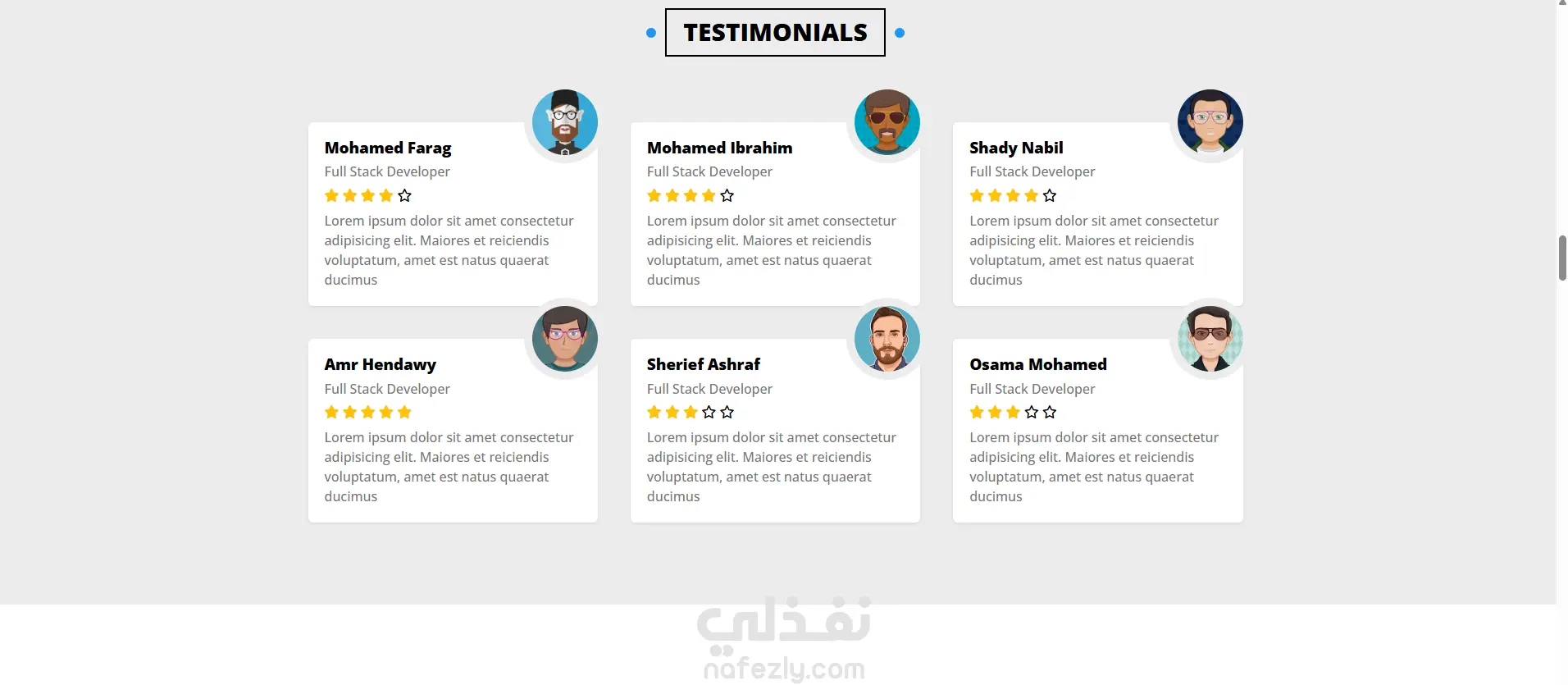 آراء العملاء (Testimonials): مع تقييمات وصور شخصية.