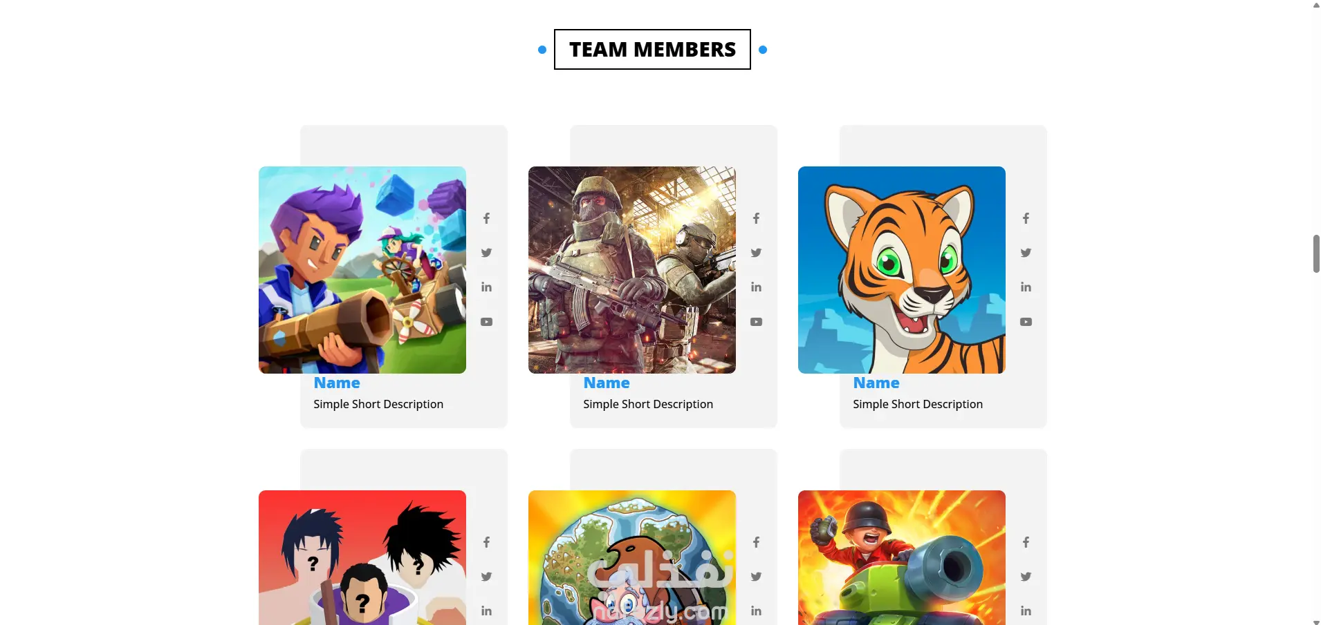 فريق العمل (Team Members): لعرض أعضاء الفريق مع روابط التواصل.