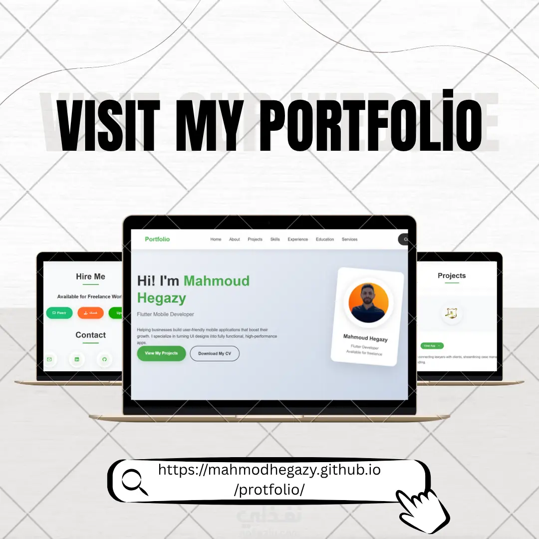 قمت بإنشاء موقع ويب شخصي كبورتفوليو يعرض أعمالي وخبراتي السابقة كمطور تطبيقات موبايل. يحتوي الموقع على نبذة عني، طرق التواصل معي، صور من المشاريع التي أنجزتها، شهاداتي، وغيرها من المعلومات التي تعكس مهاراتي المهنية. تم تطوير الموقع باستخدام HTML وCSS، وقد تم رفعه على GitHub بحيث يمكن لأي شخص الاطلاع عليه مباشرة، وقد أضفت الرابط في الخانة المخصصة لذلك في معرض الأعمال.