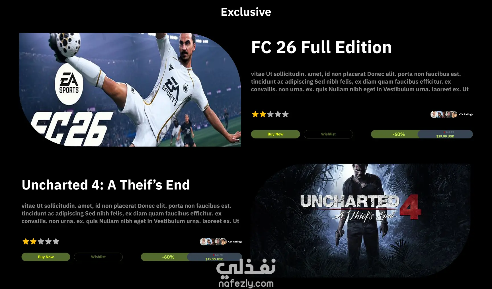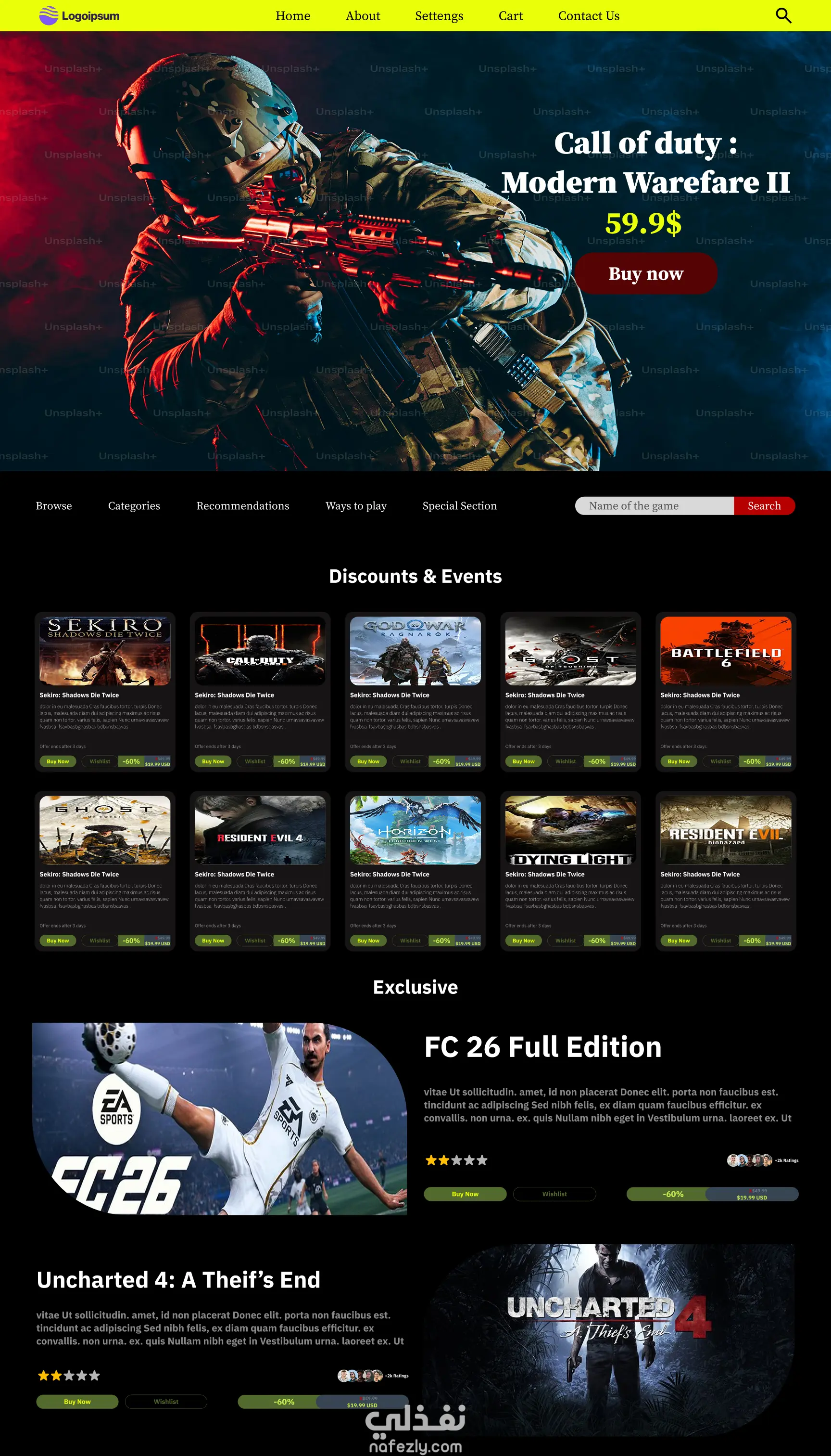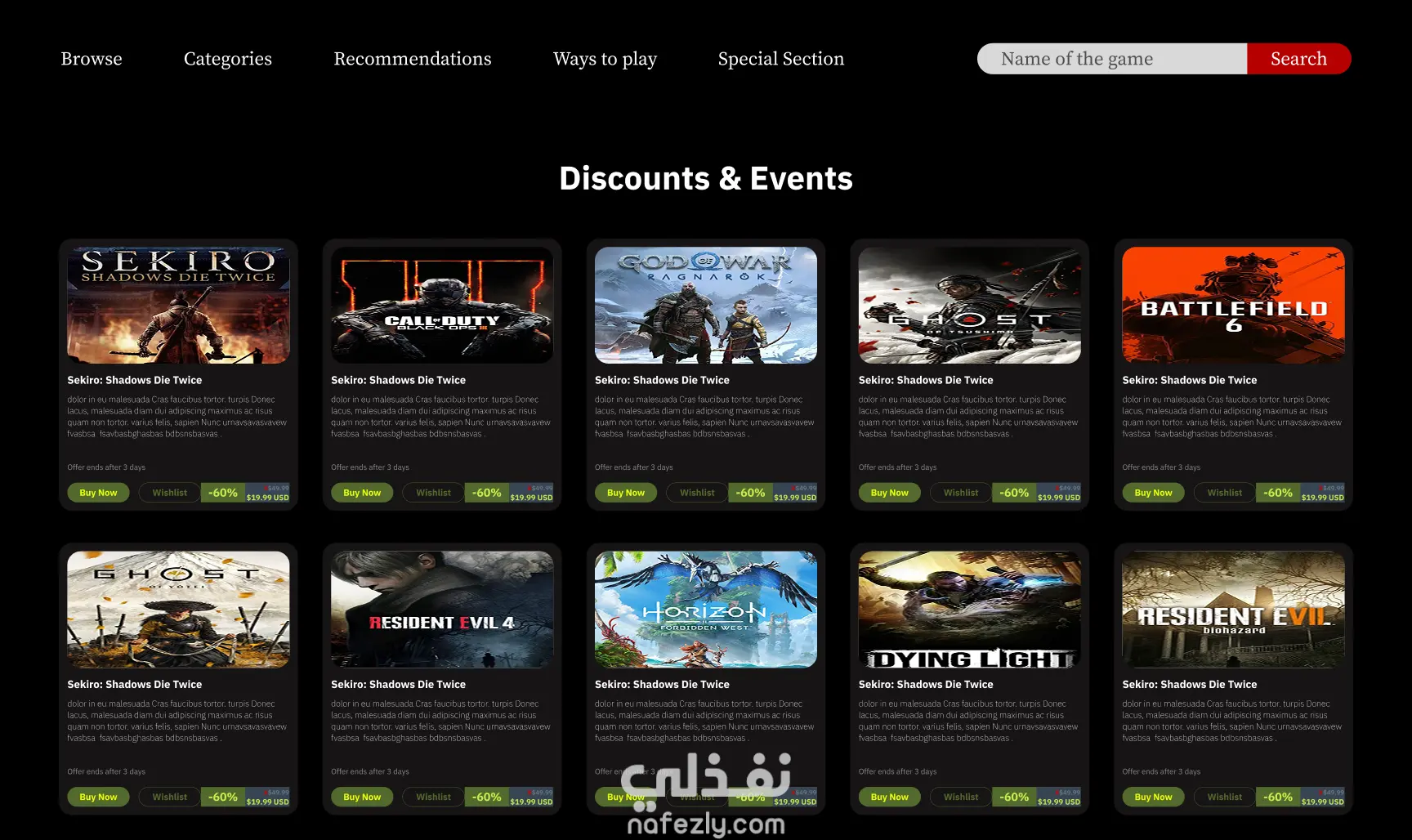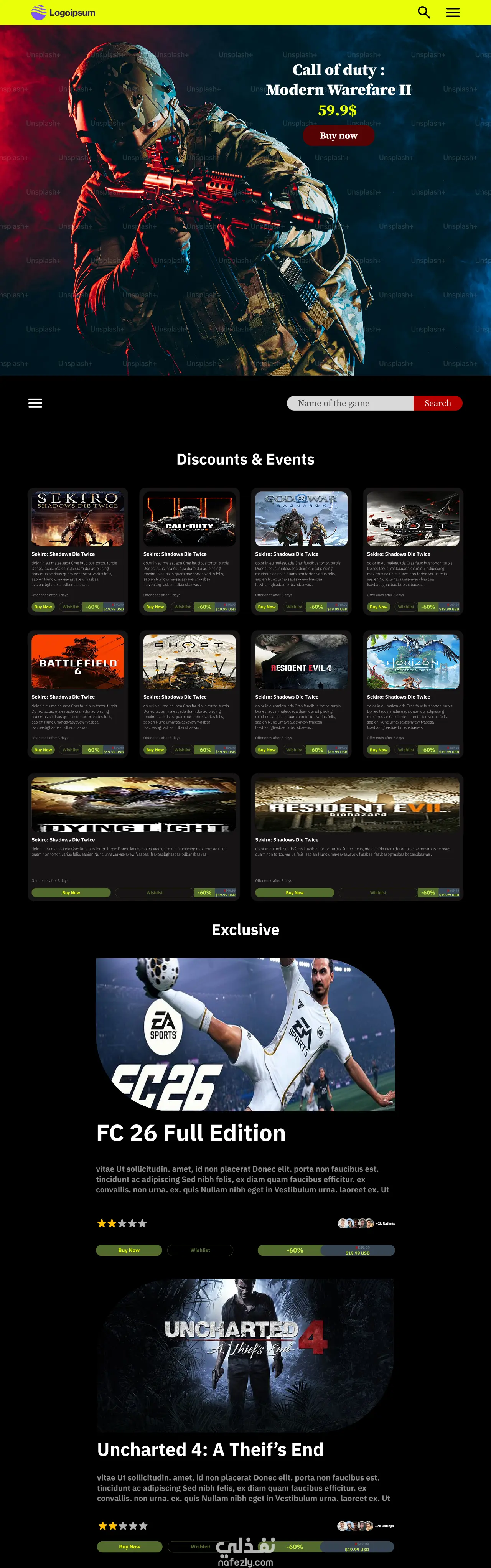 تصميم متجر اونلاين للالعاب يمكنك من خلاله شراء الالعاب والحصول على خصومات وصمم ليكون متوافق مع مع ثلاثة مقاسات منها ال Desktop, Tablet and Phone