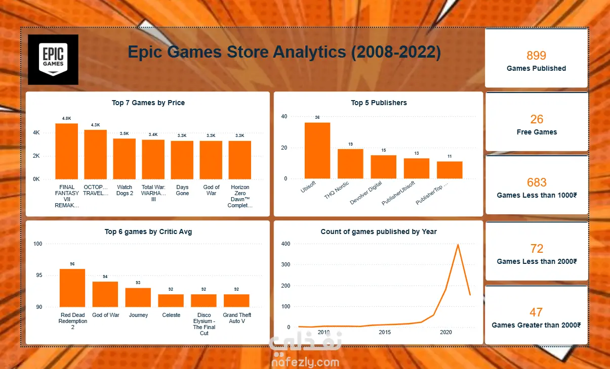 أقدم لكم لوحة معلومات تحليلية (Dashboard) شاملة قمت بتصميمها، تعرض رؤى (Insights) وإحصائيات رئيسية لمتجر Epic Games Store على مدار 14 عامًا. الهدف من المشروع: تحويل البيانات الأولية للمتجر إلى لوحة معلومات تفاعلية سهلة القراءة، تساعد صانعي القرار على فهم أداء المتجر وتوجهات السوق بنظرة واحدة. أهم المؤشرات والرؤى التي توفرها لوحة المعلومات: ملخص الأداء العام: عرض فوري لمؤشرات الأداء الرئيسية (KPIs) مثل: إجمالي الألعاب المنشورة (899 لعبة). عدد الألعاب المجانية (26 لعبة). توزيع الألعاب حسب الفئات السعرية (أقل من 1000₹، بين 1000₹-2000₹، وأكثر من 2000₹). تحليل الناشرين (Publishers): تحديد واضح لأبرز 5 ناشرين على المنصة من حيث عدد الألعاب، مع تصدّر Ubisoft للقائمة. تحليل الأسعار والتقييمات: رصد أغلى 7 ألعاب، مما يعطي مؤشرًا على سقف الأسعار في المتجر. إبراز أعلى 6 ألعاب من حيث متوسط تقييم النقاد، مما يوضح معايير الجودة (مثل تصدّر Red Dead Redemption 2). تحليل النمو التاريخي (Time-Series Analysis): رسم بياني يوضح التطور الزمني لعدد الألعاب المنشورة، ويكشف عن طفرة هائلة في النشر بدأت عام 2019 ووصلت ذروتها في 2021. المهارات التي يوضحها هذا المشروع: تحليل وعرض البيانات (Data Analysis & Visualization): القدرة على تجميع وتحليل البيانات وعرضها في رسوم بيانية واضحة (مثل المخططات الشريطية والخطية). تصميم لوحات المعلومات (Dashboard Design): بناء لوحة معلومات متكاملة ومنظمة تعرض أهم المقاييس بشكل فعال. استخلاص الرؤى (Insights): تحويل الأرقام المجردة إلى معلومات قابلة للتنفيذ (مثل تحديد اتجاهات النشر والناشرين المسيطرين). استخدام أدوات ذكاء الأعمال (BI Tools): (يمكنك هنا ذكر الأداة التي استخدمتها، مثل Power BI أو Tableau أو Excel).
