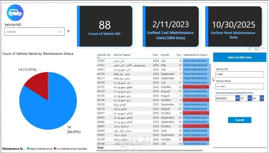 عمل تحليل للصيانه الدوريه لشركة سيارات و تصميم داشبورد تفاعلية المشروع هنا كان هدفه معرفة مواعيد الصيانه الدوريه القادمه شهريا و القدره على البحث فى الداشبورد باستخدام Vechile No و إمكانية تعديل مصدر البيانات من واجهة الداشبورد لسهولة الاستخدام و قدرت اطبق برنامج داخل الداشبورد من خلاله يتم التعديل فى الداتا و رؤية التحديث فى نفس اللحظه و بالتالى التحليل بيتحدث تلقائيا طبقا للداتا الجديده دون الرجوع لمصدر البيانات