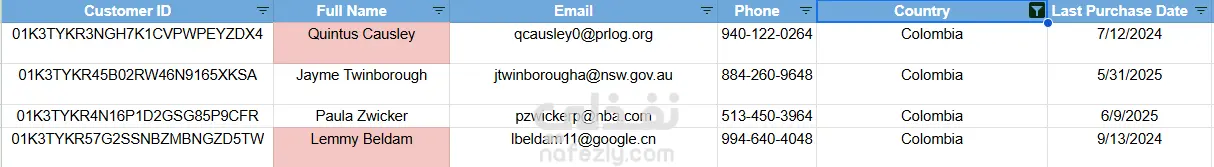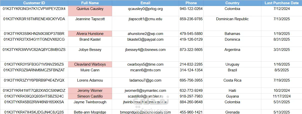 قائمة جهات اتصال منظمة للحفاظ على معلومات العملاء بشكل مرتب وسهل البحث. أهم النقاط: • أعمدة للاسم، البريد الإلكتروني، رقم الهاتف، الدولة، وغيرها. • استخدام التحقق من صحة البيانات (Data Validation) للدولة وتاريخ آخر عملية شراء. • إمكانية تصفية البيانات (Data Filtering).