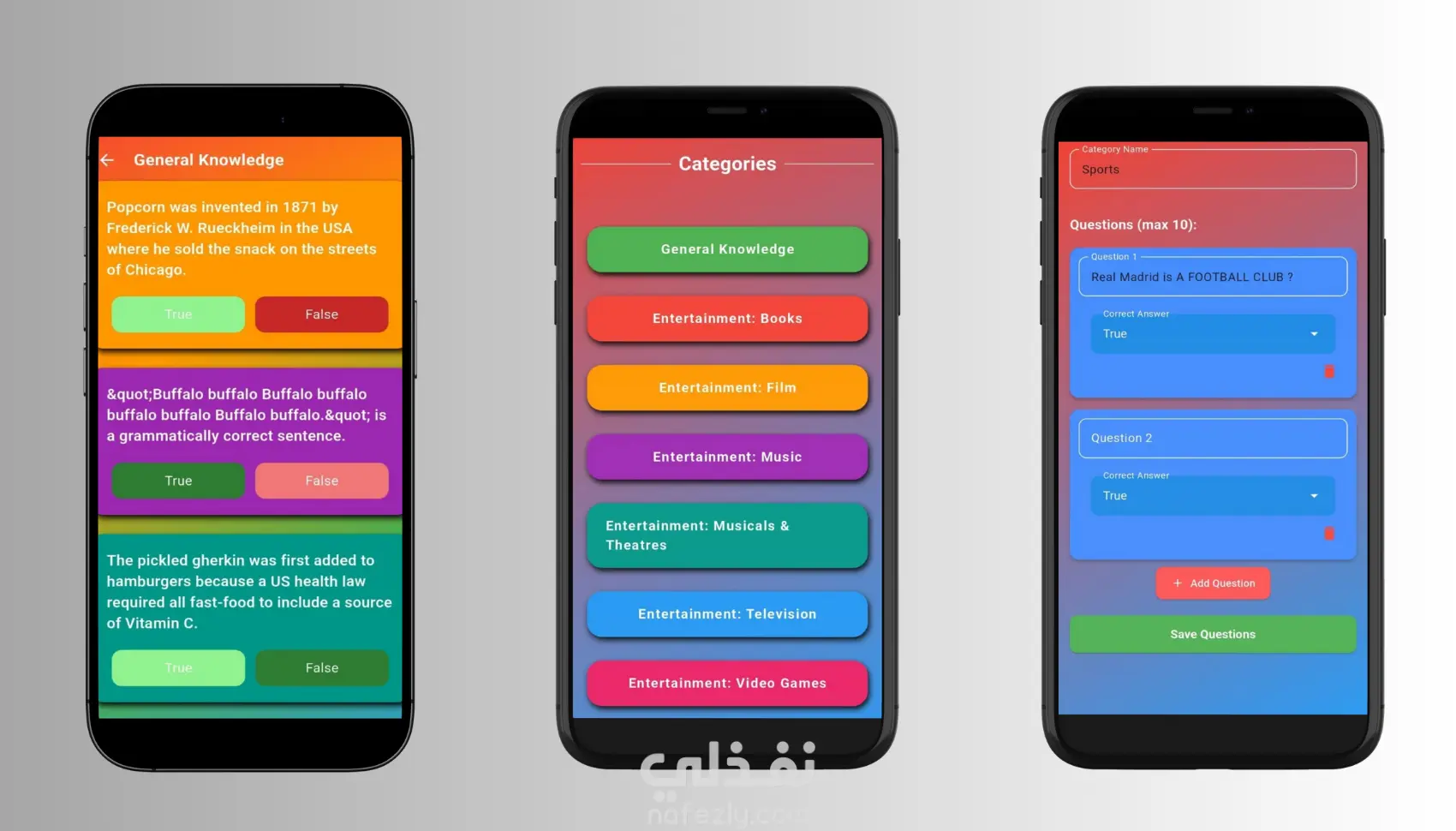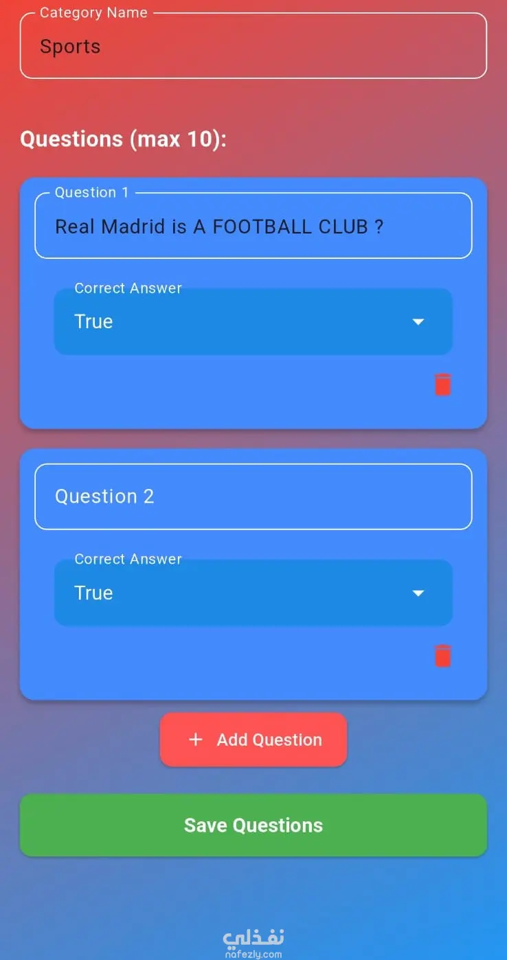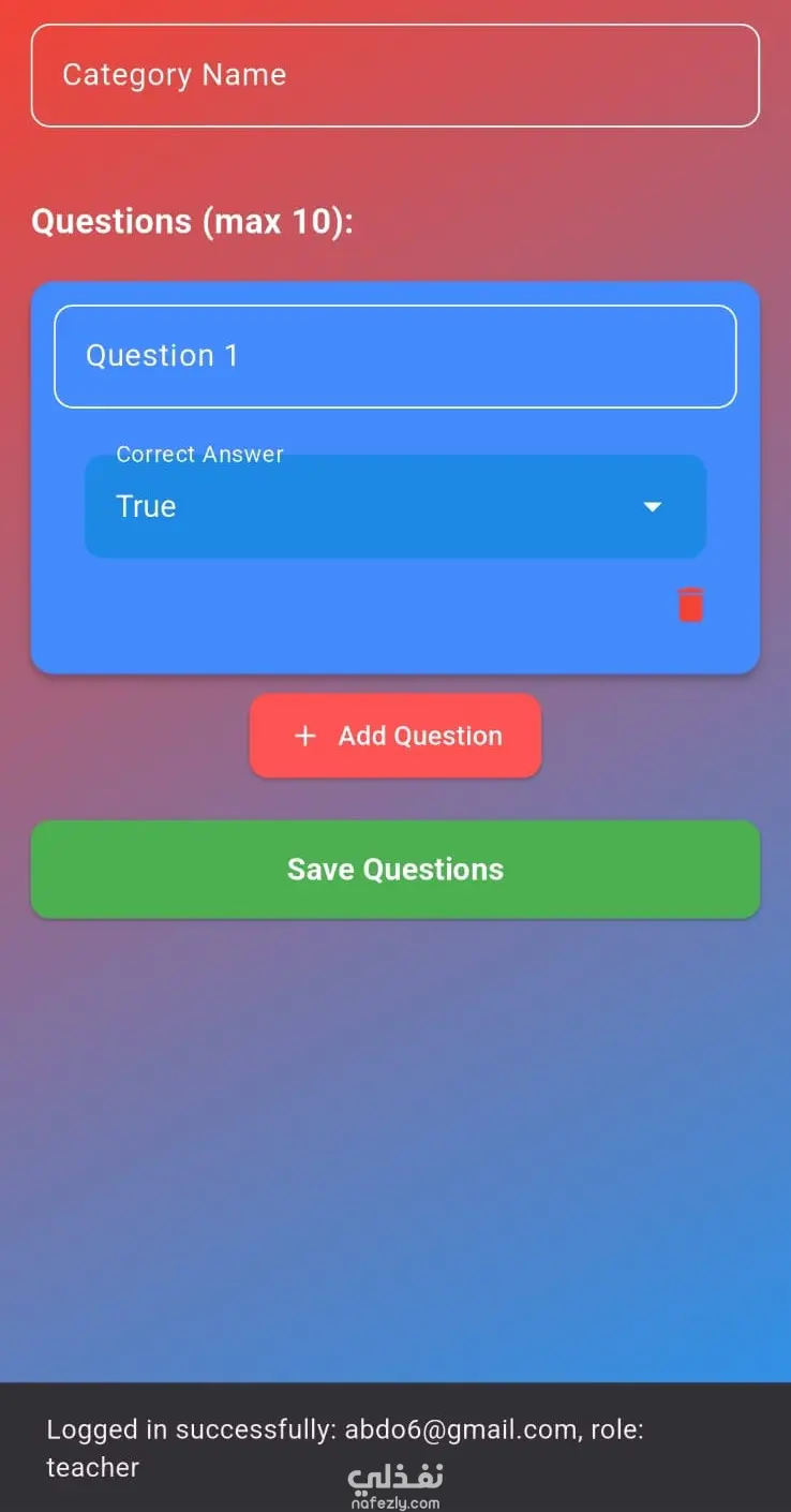 تطبيق تعليمي تم تطويره باستخدام Flutter يعتمد على فكرة التصنيفات (Categories) لمجموعة من الأسئلة في مجالات مختلفة، مثل التقنية، العلوم، التاريخ وغيرها. يمكن للطالب اختيار المجال الذي يرغب به، ثم خوض اختبار مكوّن من عشرة أسئلة يتم عرضها بشكل تفاعلي، ليجيب عنها ويُعرض له في النهاية النتيجة (Score) توضح عدد الإجابات الصحيحة والخاطئة. يحتوي التطبيق أيضًا على نظام للمدرسين يمكن من خلاله تسجيل الدخول كـ Teacher وإنشاء تصنيفات خاصة بهم، مع إمكانية إضافة الأسئلة والإجابات الصحيحة داخلها، لتُعرض هذه التصنيفات لاحقًا ضمن القائمة العامة للطلاب، بحيث تصبح متاحة للجميع لحلها. تم بناء التطبيق باستخدام Flutter مع تطبيق نمط إدارة الحالة (State Management) بواسطة Provider لضمان تحديث الواجهة بشكل فوري وسلس عند إضافة الأسئلة أو احتساب النتائج. تم الاهتمام بتصميم واجهة عصرية وسهلة الاستخدام تعتمد على مكونات مرتبة وألوان متناسقة لتوفير تجربة ممتعة لكل من الطالب والمدرس.