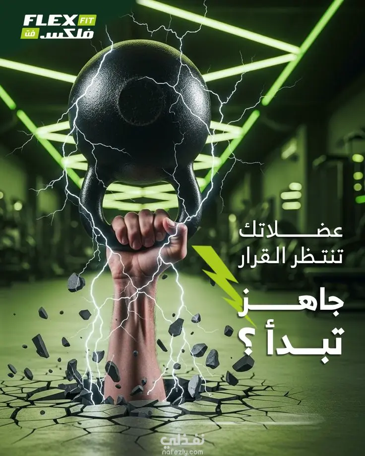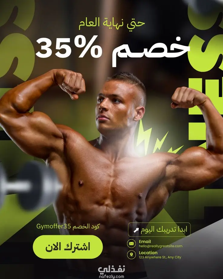 خلق تأثير بصري فوري: استخدام صورة لاعب كمال أجسام قوي بوضع درامي (Dramatic Pose) يخلق اتصالاً عاطفياً مباشراً مع الجمهور المستهدف (الرياضيين/الباحثين عن اللياقة).