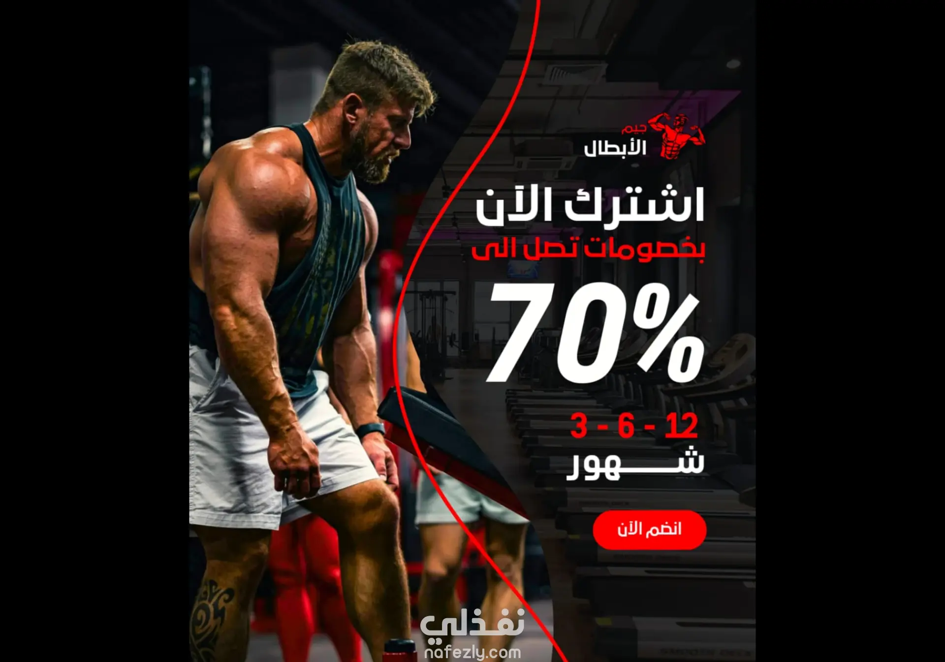 هذا المشروع هو عبارة عن تصميم إعلان ديناميكي لوسائل التواصل الاجتماعي (Instagram/Facebook) لصالح "صالة الأبطال" (Gym Al-Abtal)، يهدف إلى تحفيز المشتركين الجدد للاستفادة من عرض الخصم الحصري. ركز التصميم على دمج الطاقة البصرية العالية مع رسالة تسويقية واضحة ومباشرة.