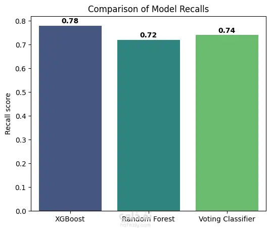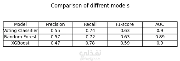 في هذا المشروع، قمتُ بمقارنة عدة نماذج — Random Forest و XGBoost و Voting Classifier — لاختيار النموذج الأكثر فعالية في التنبؤ. وقد تميّز نموذجVoting Classifier بتحقيقه أعلى معدلات الدقّة (Accuracy) والاستدعاء (Recall) والدقّة الإيجابية (Precision).