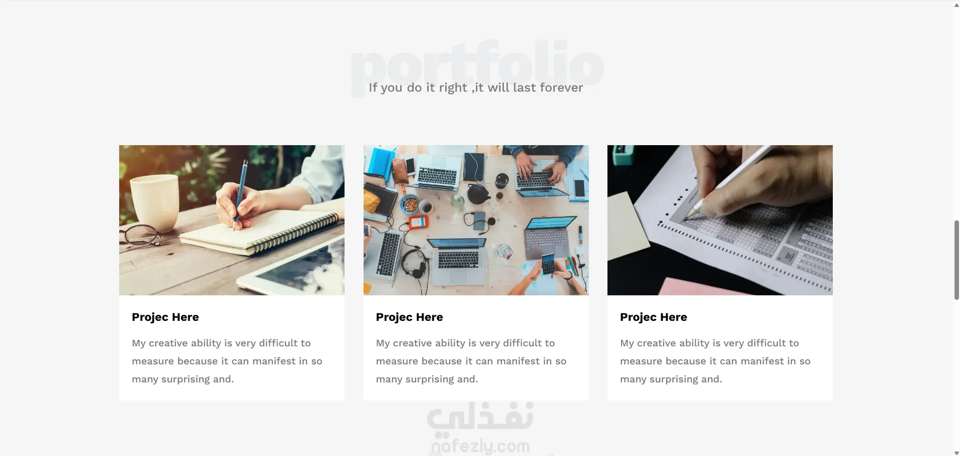 أعمالنا (Portfolio): قسم خاص بعرض المشاريع مع صور وبطاقات تعريفية.