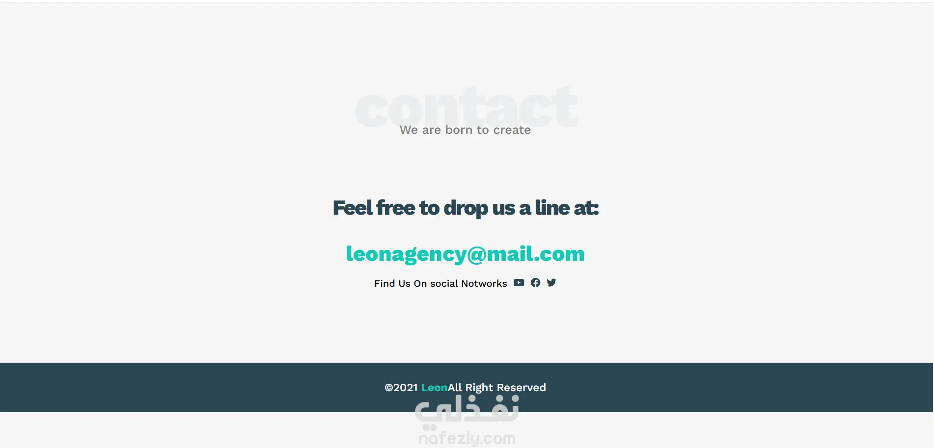 تواصل معنا (Contact): يحتوي على إيميل للتواصل وروابط شبكات التواصل الاجتماعي (YouTube، Facebook، Twitter).