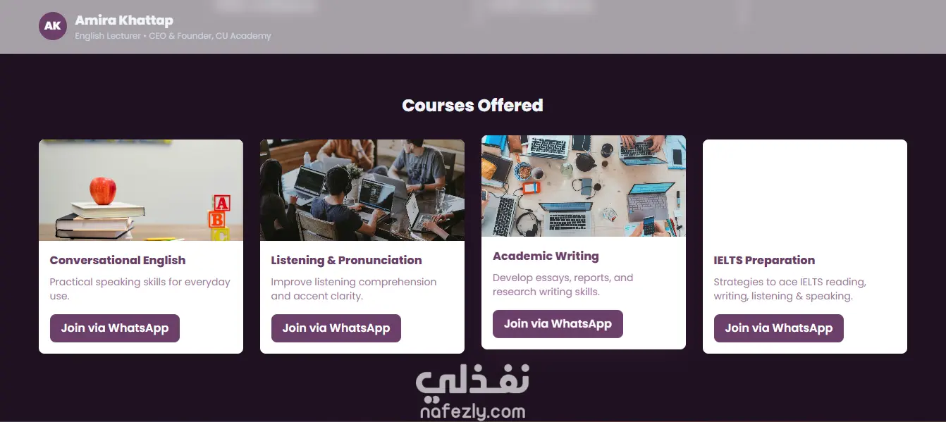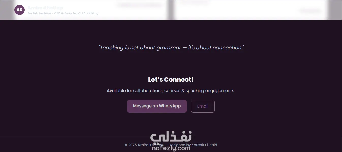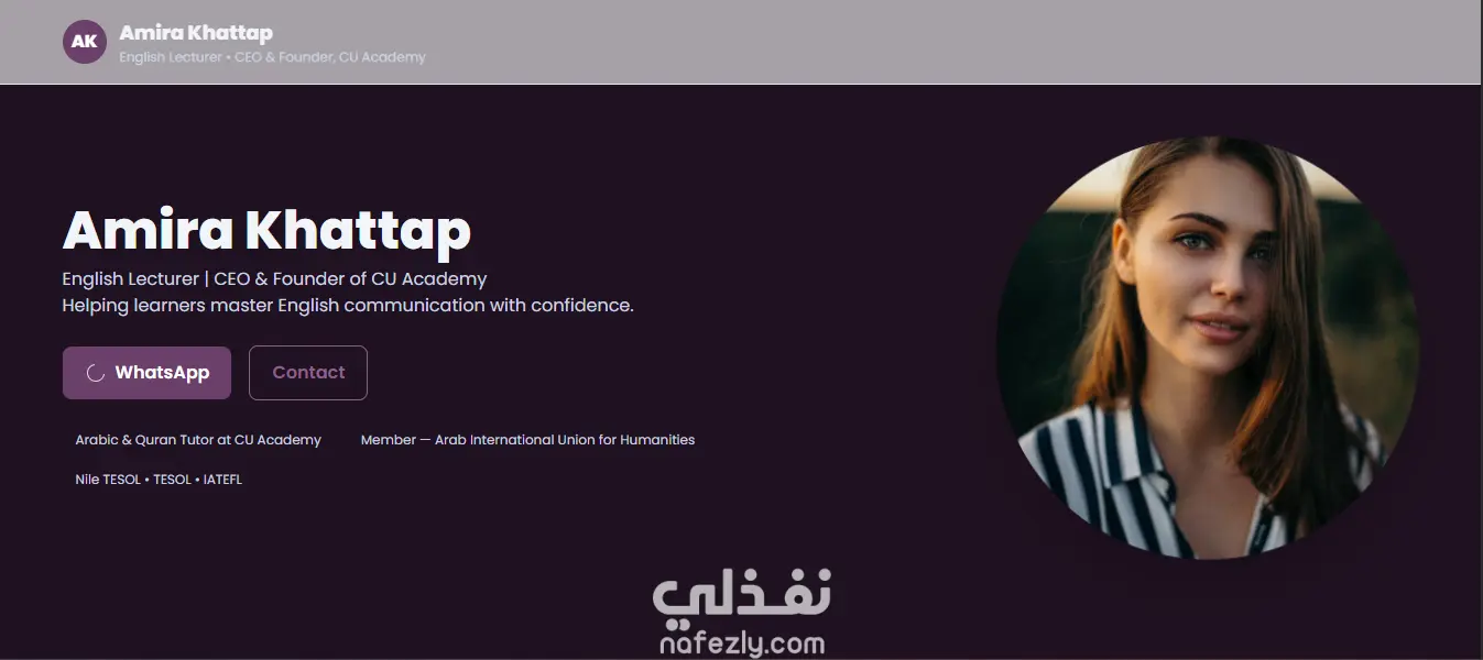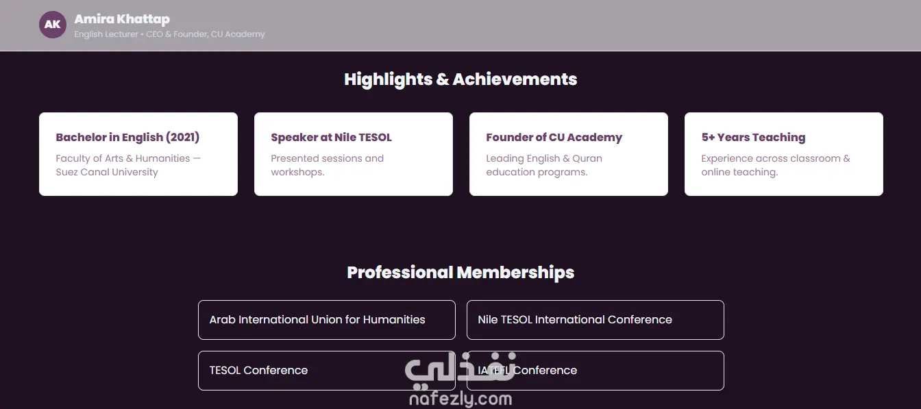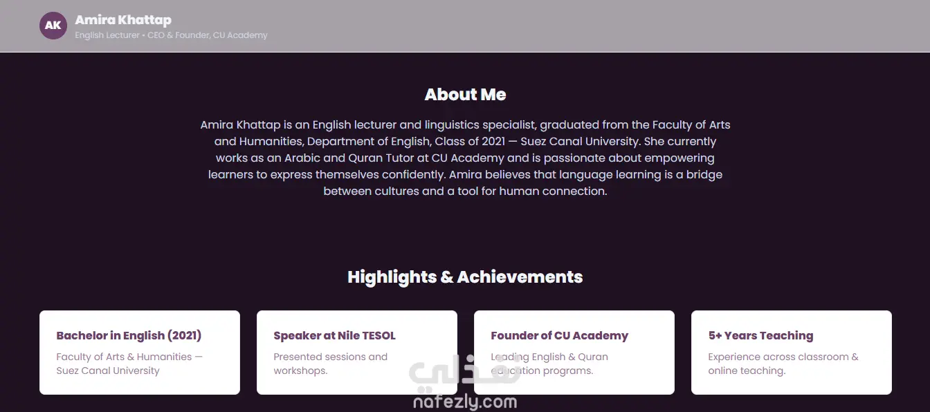 تفاصيل العمل: الوصف: موقع بورتفوليو شخصي لعرض مهارات الدكتورة أميرة بطريقة جذابة واحترافية. التقنيات المستخدمة: HTML، CSS، Tailwind CSS الميزات الرئيسية: تصميم عصري وسلس على كل الأجهزة (Responsive Design) أقسام متعددة: نبذة عن الشخص، المعرض، الاتصال تجربة مستخدم واضحة وسهلة التصفح الهدف: مساعدة العميل في عرض مهاراته وخبراته بطريقة احترافية على الإنترنت.