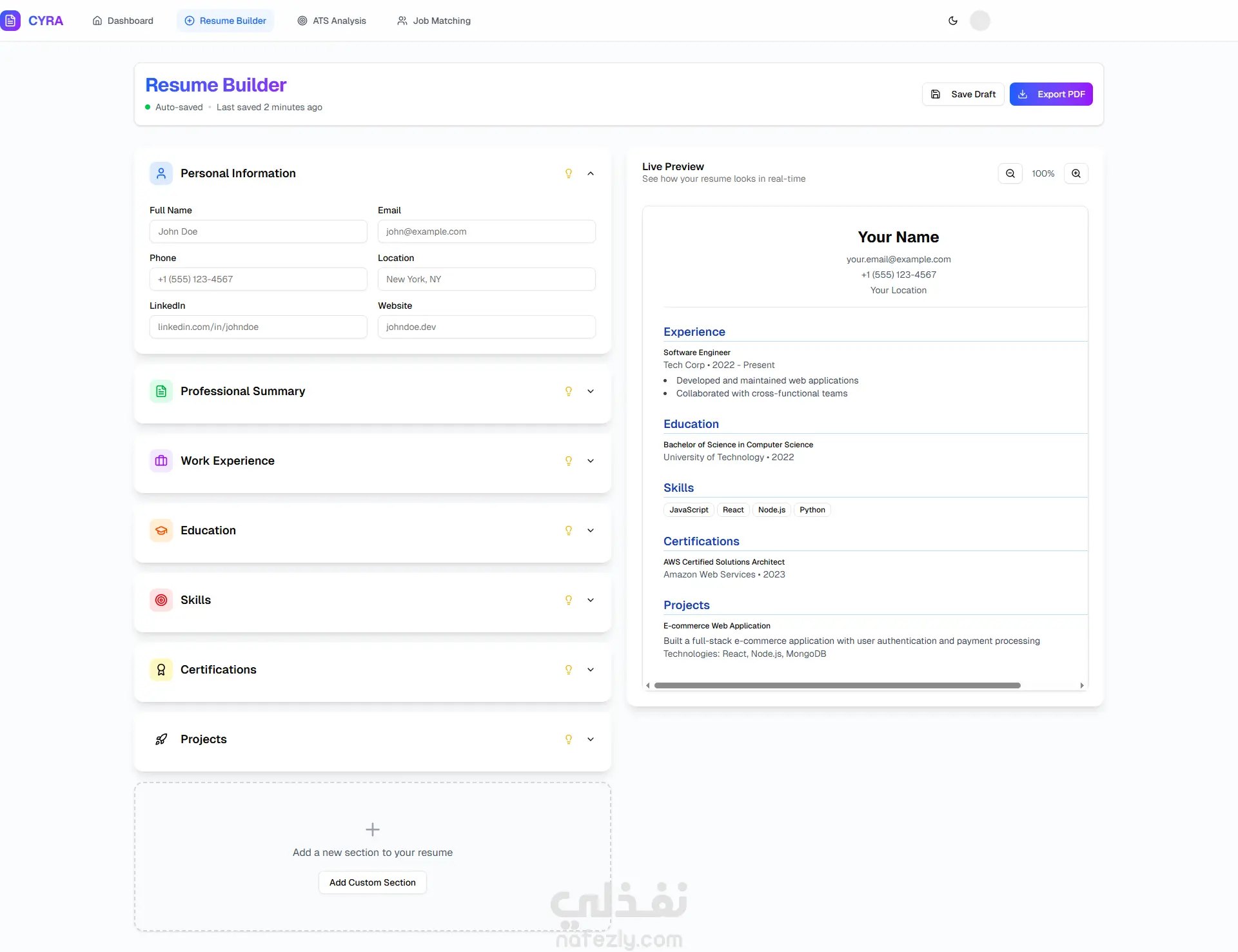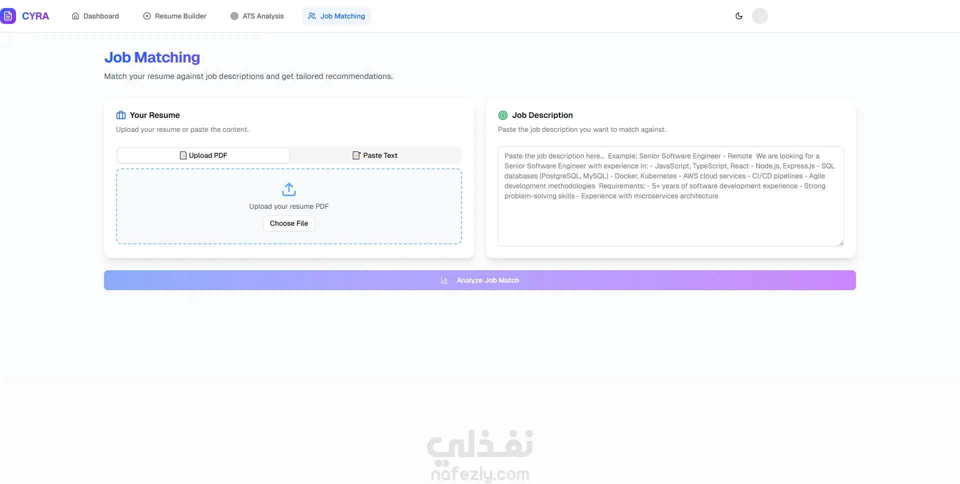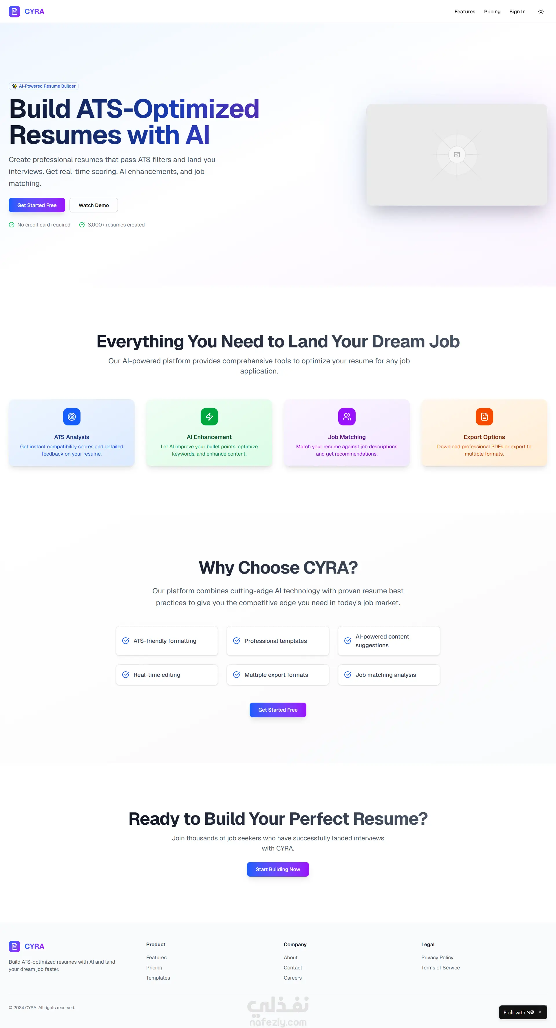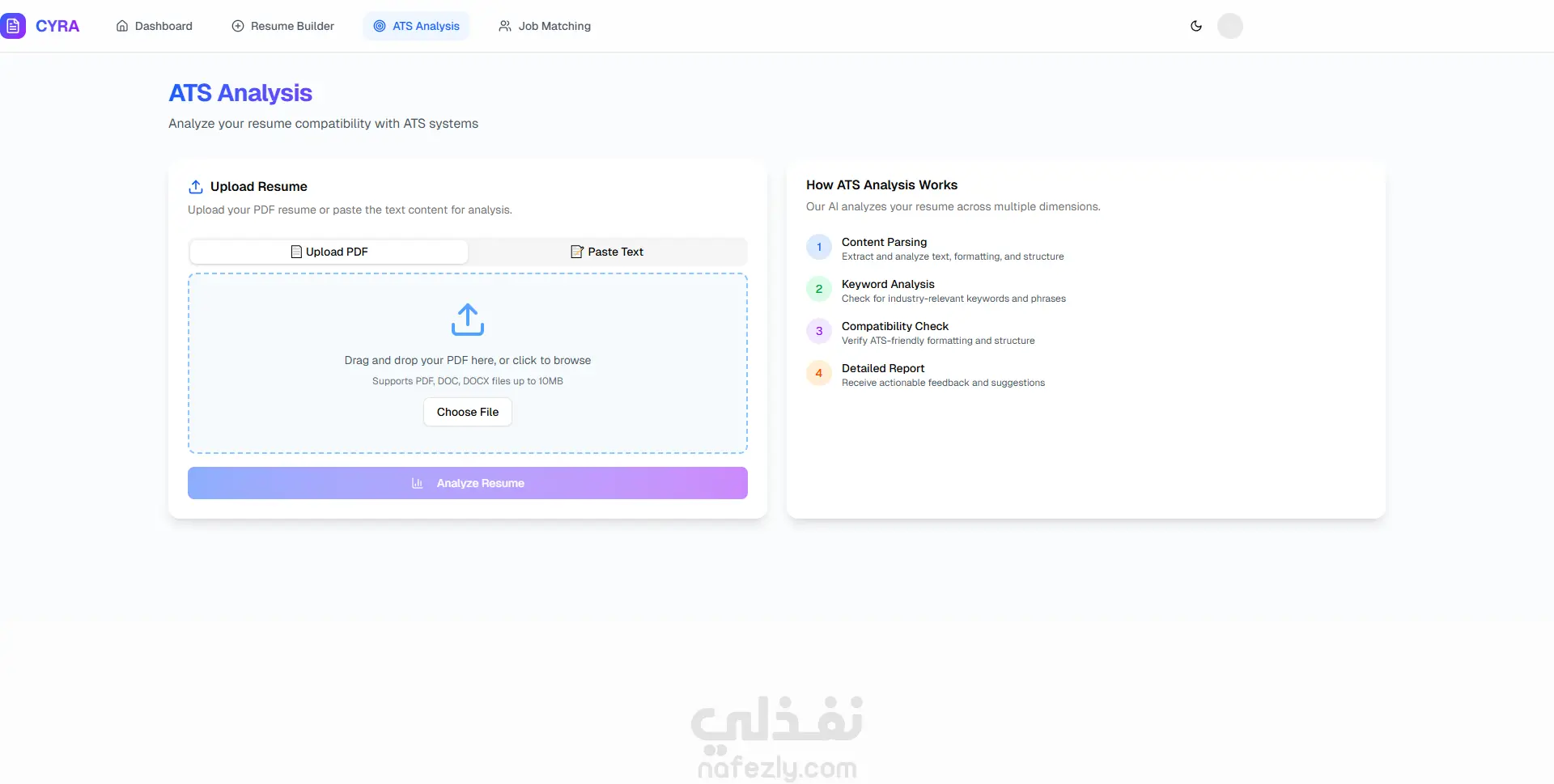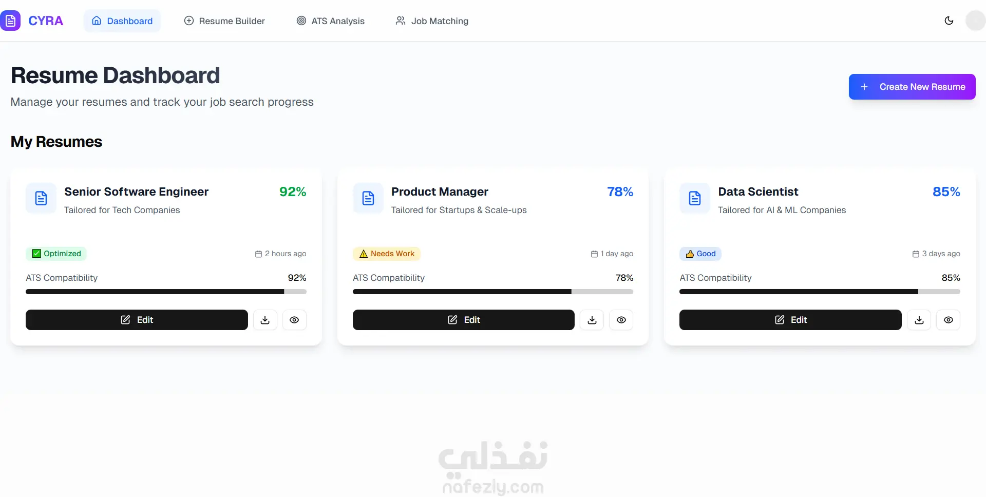 يعمل CYRA على سد الفجوة بين الباحثين عن عمل وأصحاب العمل، من خلال ضمان أن تكون السير الذاتية جذّابة بصريًا ومنسقة بطريقة تجعلها تتجاوز أنظمة الفرز الآلي (ATS) بنجاح، مما يزيد من فرص الحصول على مقابلات عمل. الميزات الرئيسية 1. مُنشئ السيرة الذاتية واجهة تفاعلية سهلة الاستخدام تتيح للمستخدمين: إدخال محتوى السيرة الذاتية في أقسام متعددة (المعلومات الشخصية، الخبرات، التعليم، المهارات، الشهادات، المشاريع) مشاهدة معاينة مباشرة للسيرة الذاتية أثناء الكتابة إدارة المهارات بشكل ديناميكي تصدير السيرة الذاتية بصيغة PDF احترافية 2. تحليل ATS أداة تحليل شاملة تقوم بـ: فحص السيرة الذاتية لتوافقها مع أنظمة تتبع المتقدمين تقديم درجات مطابقة الكلمات المفتاحية تحديد نقاط القوة والضعف تقديم اقتراحات عملية للتحسين مع تحديد أولوياتها 3. مطابقة الوظائف نظام ذكي يقوم بـ: مقارنة السيرة الذاتية مع وصف وظيفي محدد تحديد الكلمات المفتاحية المطابقة والمفقودة تحليل الفجوات المهارية تقديم توصيات موجهة لتحسين السيرة الذاتية 4. إدارة الملف الشخصي خصائص لتخصيص تجربة المستخدم تشمل: المعلومات الشخصية وبيانات التواصل تفضيلات الوظائف ومعايير البحث إعدادات تحسين الذكاء الاصطناعي إدارة السير الذاتية المحفوظة 5. لوحة التحكم المركز الرئيسي الذي يوفّر: وصولًا سريعًا لجميع السير الذاتية عرض درجات ATS وحالة كل سيرة أزرار وصول سريع إلى الأدوات الأساسية أدوات لإدارة السير الذاتية