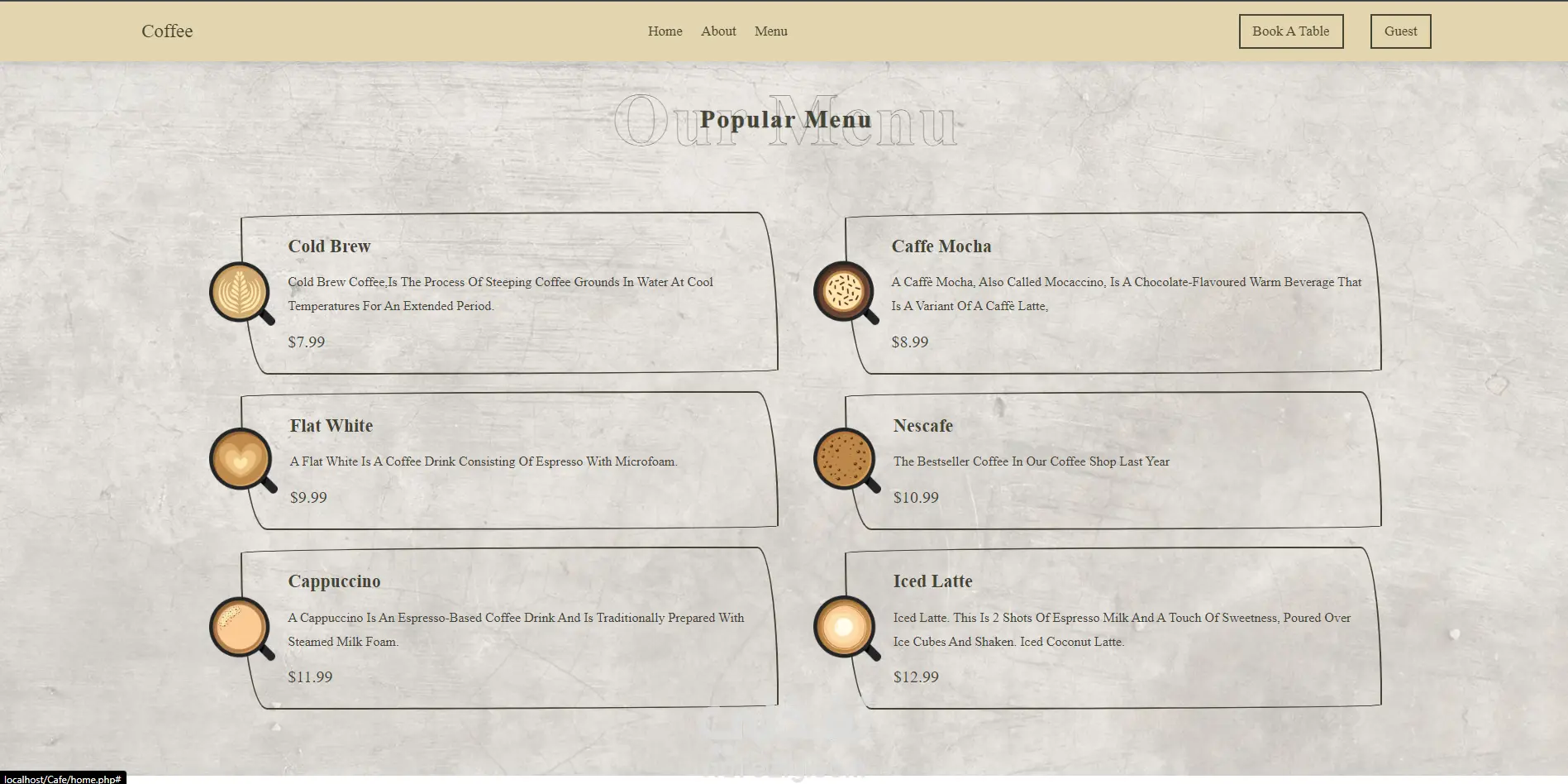 يُعد موقع المقهى تطبيق ويب تفاعلي تم تطويره باستخدام HTML، CSS، JavaScript، وPHP.