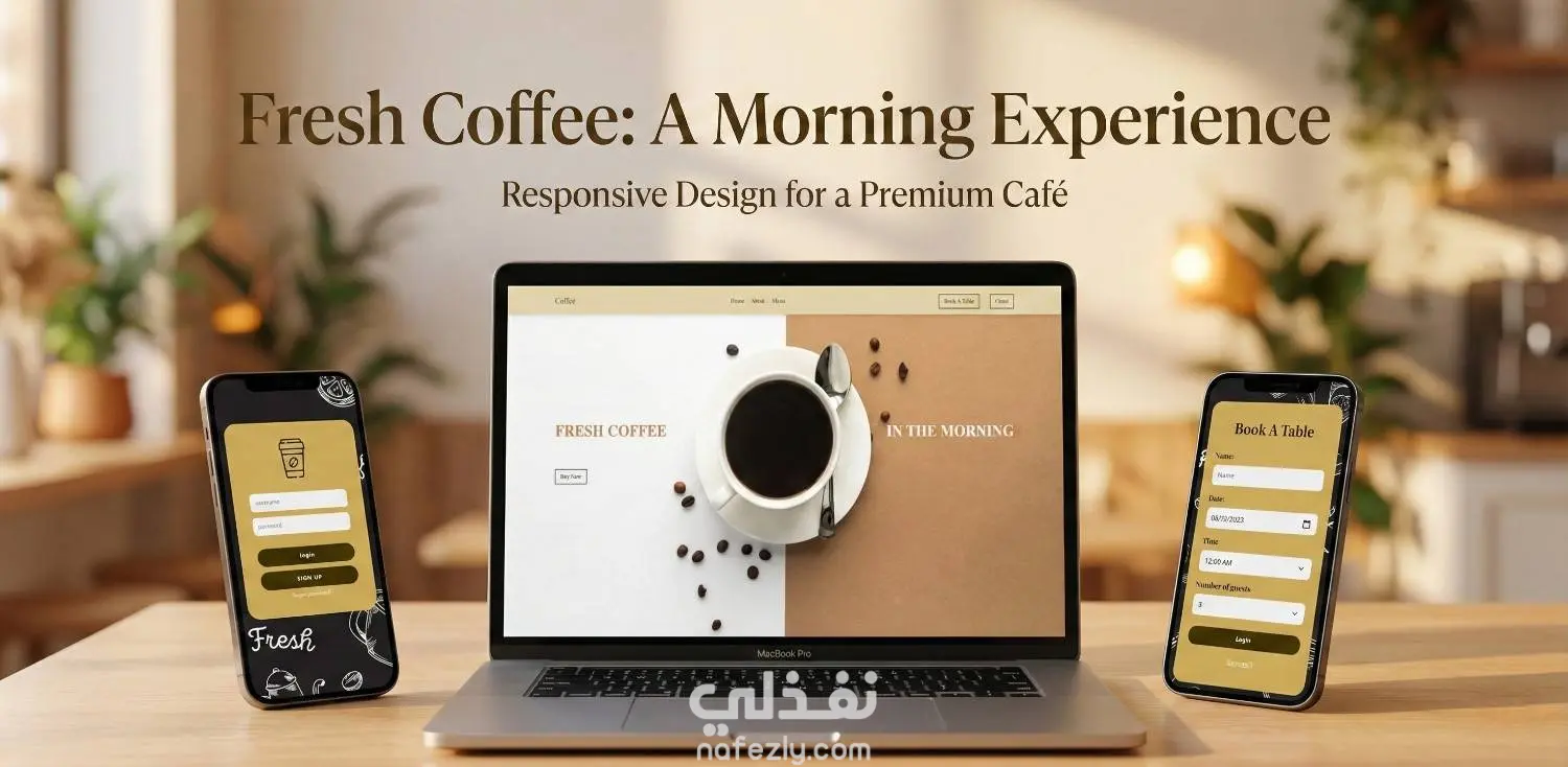تم تصميم الواجهة بأسلوب حديث وبسيط مع ألوان دافئة تعكس جو المقاهي الهادئ والمريح.