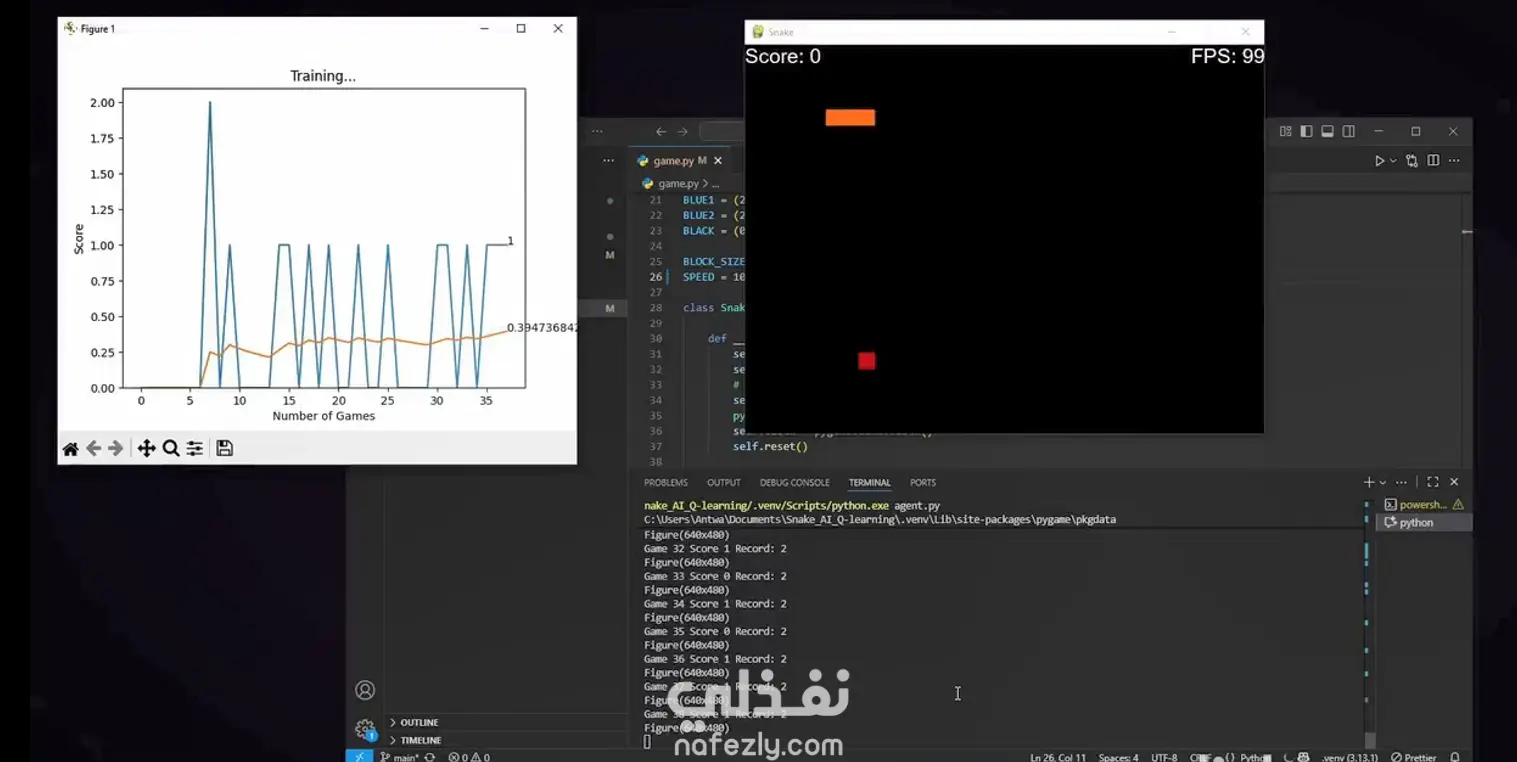 مشروع يقدّم نسخة ذكية من لعبة الثعبان (Snake)، حيث تم تطوير ذكاء اصطناعي قادر على تعلّم طريقة اللعب ذاتيًا باستخدام خوارزمية التعلّم المعزز (Deep Q-Learning). يتعلّم الذكاء الاصطناعي من خلال التجربة والخطأ، فيُحسّن من أدائه تدريجيًا ليتمكّن من جمع الطعام وتجنّب الاصطدام وتحقيق أعلى النقاط دون أي تدخل بشري. يهدف المشروع إلى عرض تطبيق عملي لمفاهيم الذكاء الاصطناعي والتعلّم الآلي داخل بيئة ألعاب تفاعلية، مع واجهة مرئية تُظهر تقدّم التدريب والنتائج في الوقت الحقيقي.