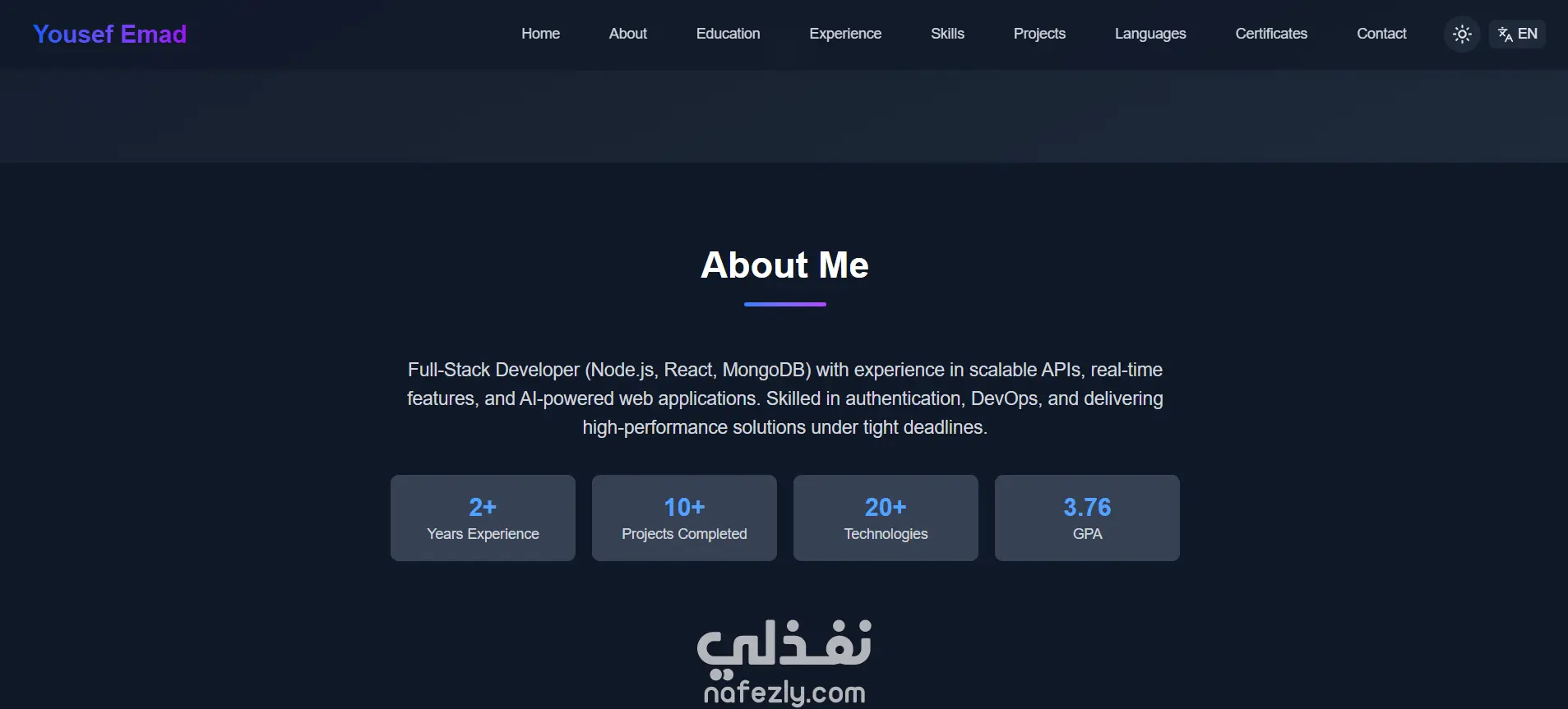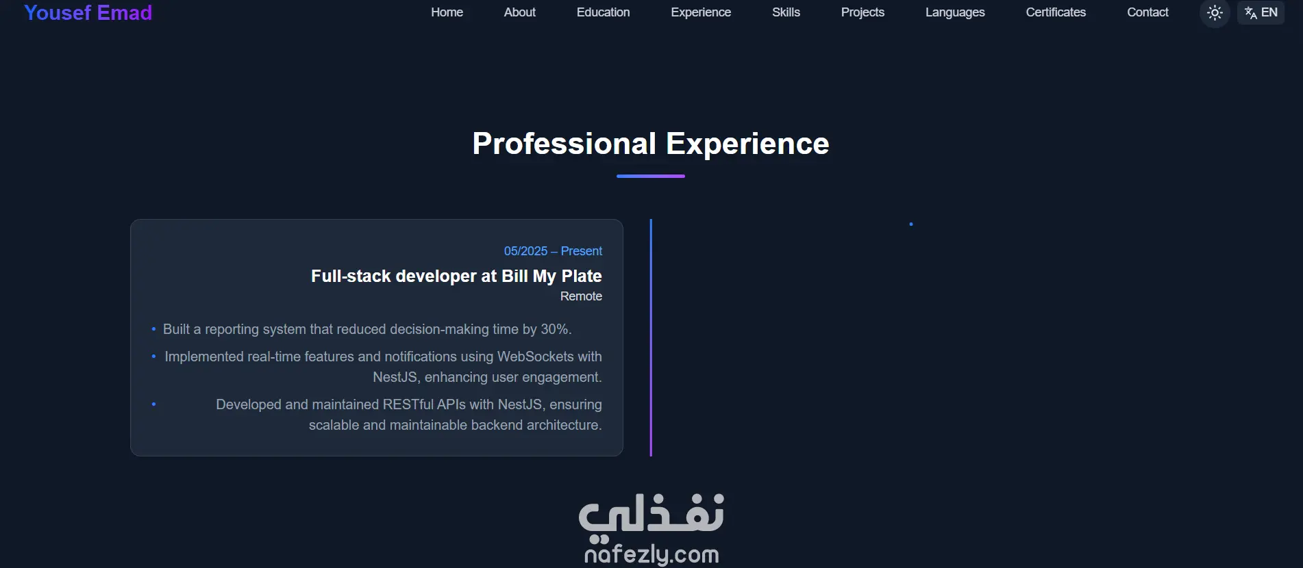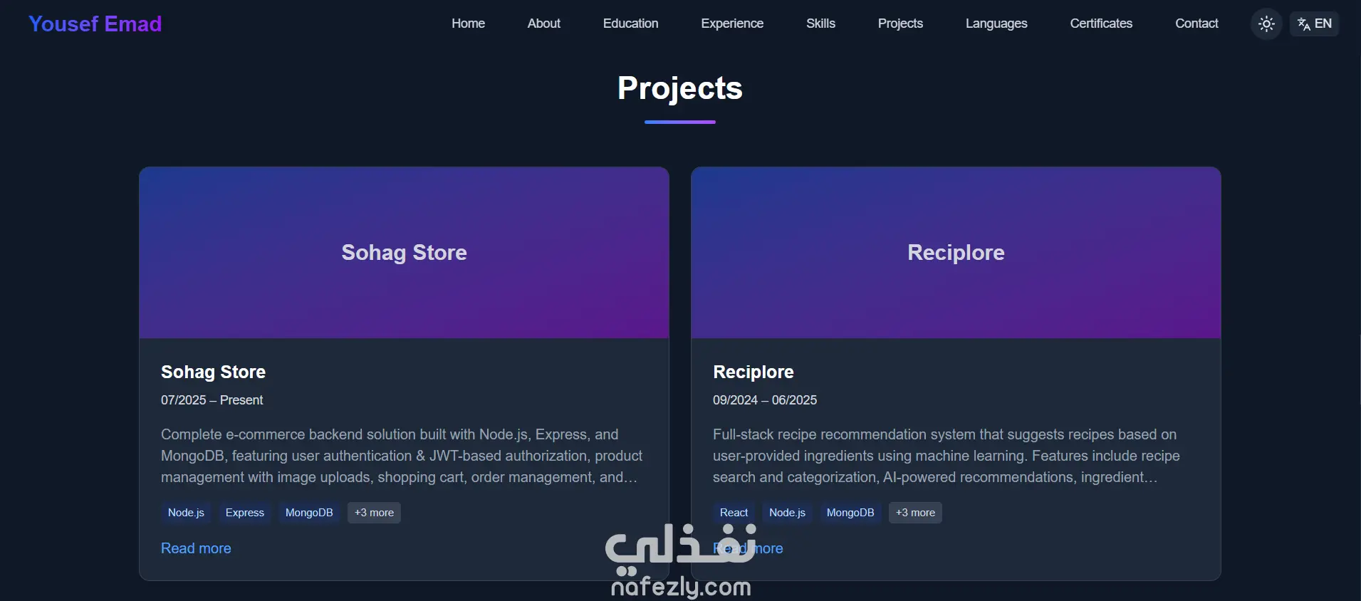 مشروعي الأول هو موقعي الشخصي (Web Portfolio) الذي قمت بتطويره باستخدام React.js لعرض مهاراتي ومشاريعي في مجال تطوير الويب بطريقة حديثة واحترافية.