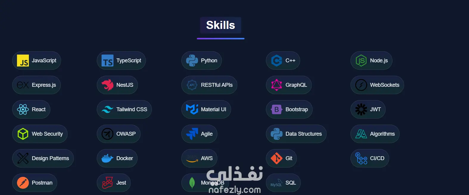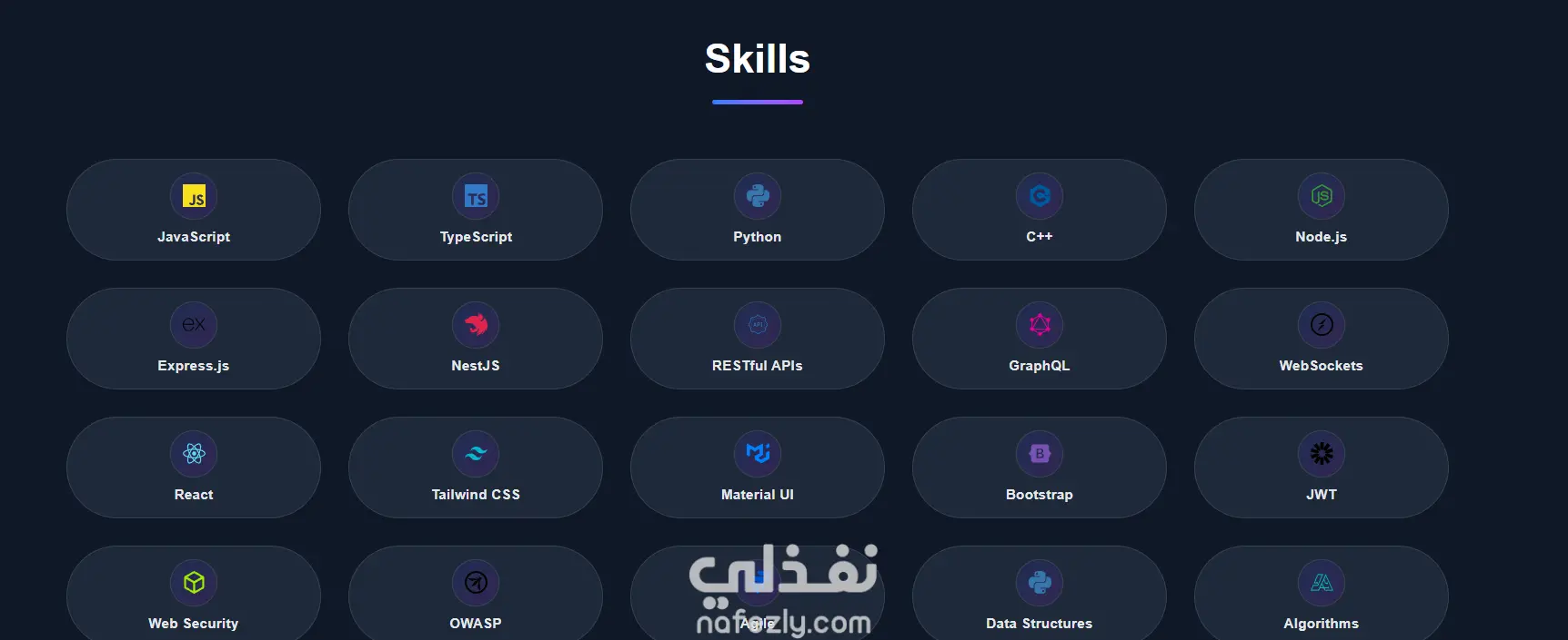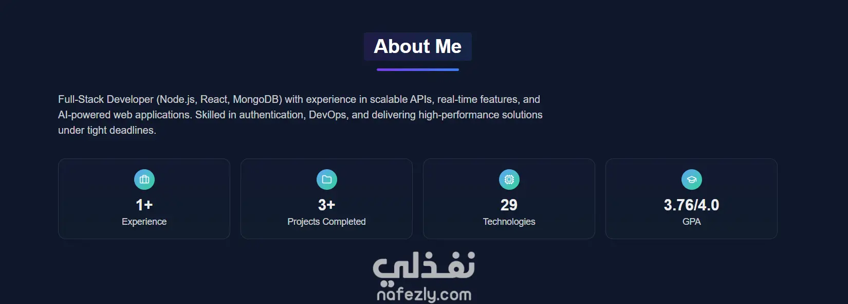 الموقع يتضمن أقسامًا للتعريف بي، المهارات، المشاريع، ووسائل التواصل، مع تنظيم واضح وسهولة في التحديث أو التطوير مستقبلًا.