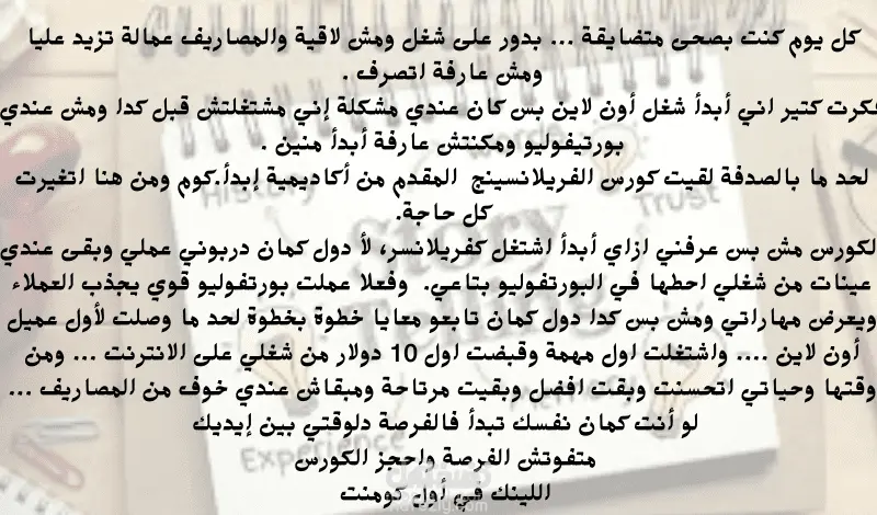 كتبت محتوى تسويقي بطريقة (storytelling) للترويج لكورس فريلانسينج. اعتمدت على تقديم تجربة شبيهة بالواقع لشخص بدأ رحلته في العمل الحر وكيف تغلب على التحديات في البداية. المحتوى يبرز قيمة ومميزات الكورس بطريقة جذابة مع تشجيع الجمهور المستهدف على اتخاذ خطوة للاشتراك في الكورس.