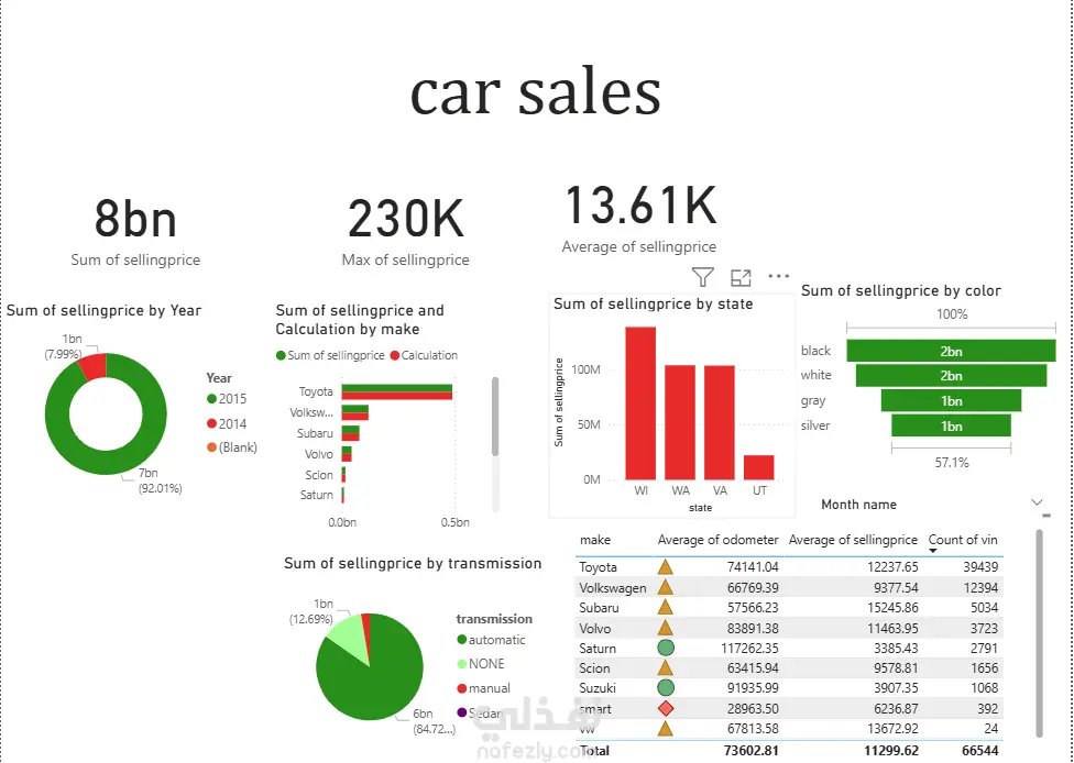 تقدم هذه اللوحة تحليلاً شاملاً لأداء مبيعات السيارات، حيث تبرز إجمالي الإيرادات الذي بلغ 8 بليون، مع أعلى سعر بيع فردي عند 550,300. تتيح اللوحة تصفية البيانات وعرضها من خلال عدة عدادات رئيسية: تحليل الإيرادات: توزيع الإيرادات حسب نوع ناقل الحركة (أوتوماتيك، مانيوال)، ولون المركبة، والولاية، وسنة الصنع، حيث شكلت مبيعات عام 2015 النسبة الأكبر (92%). تحليل العلامات التجارية: مقارنة أداء العلامات التجارية (مثل تويوتا، فولكسفاجن، سوبارو) من حيث إجمالي الإيرادات ومتوسط سعر البيع ومتوسط عدد الأميال. رؤى مفصلة: تتبع حجم المبيعات عبر الأشهر، مع توفير بيانات عدد المركبات المباعة (67) ومتوسط سعر البيع (13,610). تم تصميم هذه اللوحة لتوفير رؤية فورية وواضحة تساعد في اتخاذ القرارات الاستراتيجية وتحديد الاتجاهات السوقية.