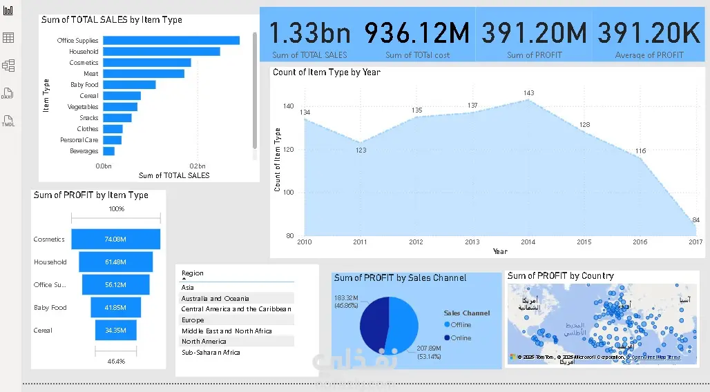 تم إنشاء لوحة بيانات تفاعلية باستخدام Power BI لعرض وتحليل بيانات المبيعات والأرباح بشكل شامل. تهدف اللوحة إلى مساعدة متخذي القرار في تتبع الأداء العام عبر فترات زمنية مختلفة، وفهم أنماط الربحية والمبيعات حسب نوع المنتج، القنوات البيعية، والمناطق الجغرافية.