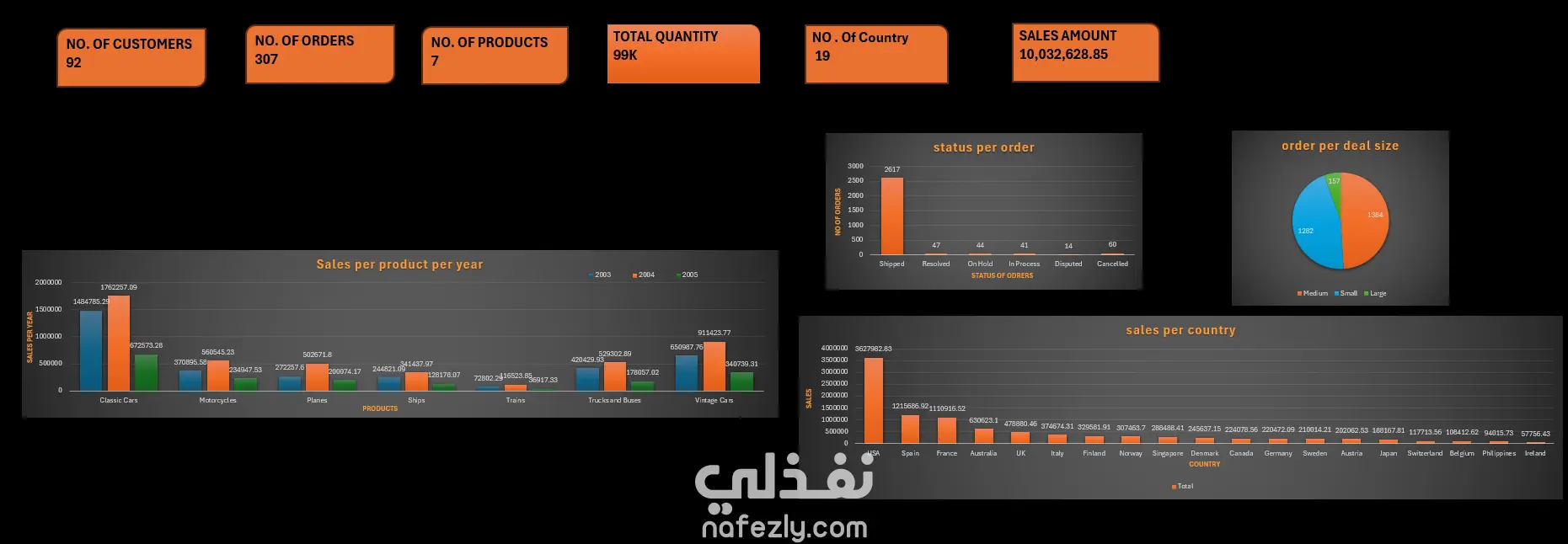 تم إنشاء لوحة مؤشرات تفاعلية باستخدام Excel لتحليل بيانات المبيعات الخاصة بشركة منتجات متعددة الفئات، بهدف متابعة الأداء العام وفهم سلوك المبيعات حسب المنتج والدولة وحجم الصفقة وحالة الطلبات. تعرض اللوحة بيانات شاملة حول العملاء، الطلبات، المنتجات، الكميات المباعة، والمبيعات الإجمالية في فترة زمنية محددة. البيانات الأساسية: عدد العملاء: 92 عدد الطلبات: 307 عدد المنتجات: 7 إجمالي الكمية المباعة: 99,000 وحدة عدد الدول: 19 إجمالي المبيعات: 10,032,628.85 دولار أهم النتائج: فئة Classic Cars تصدّرت المبيعات بإجمالي 1.76 مليون دولار سنويًا. الولايات المتحدة الأمريكية هي السوق الأقوى بمبيعات 3.6 مليون دولار، تليها إسبانيا وفرنسا. تم شحن أكثر من 85% من الطلبات بنجاح، بينما كانت نسب الإلغاء أقل من 2%. أحجام الصفقات توزعت بين: متوسطة (45%)، صغيرة (42%)، وكبيرة (13%).