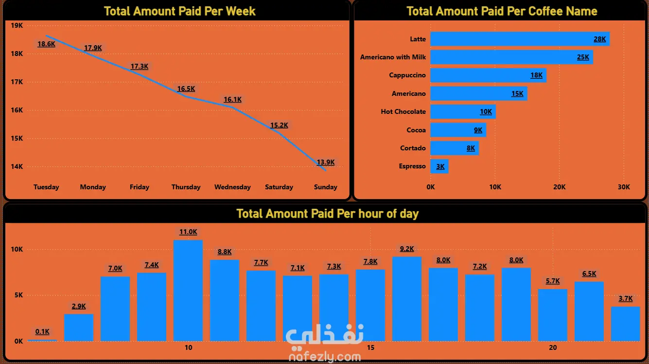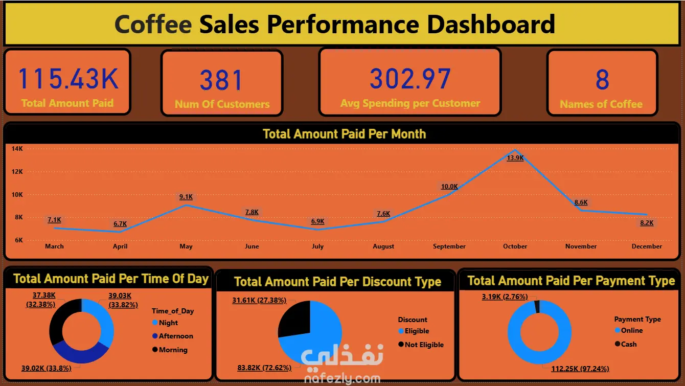 تم إنشاء لوحة مؤشرات تفاعلية باستخدام Power Bi لتحليل بيانات مبيعات القهوة بهدف تتبع الأداء وتحسين القرارات التسويقية والتشغيلية. تعرض اللوحة مؤشرات رئيسية تشمل إجمالي المبيعات، عدد العملاء، متوسط إنفاق العميل، أكثر أنواع القهوة مبيعًا، توزيع المبيعات حسب الأيام والساعات، بالإضافة إلى طرق الدفع ونسب الاستفادة من الخصومات. أهم النتائج: إجمالي المبيعات بلغ 115.43 ألف. عدد العملاء 381 بمتوسط إنفاق 302.97 لكل عميل. أكثر نوع مبيعًا هو Latte بإجمالي 28 ألف. أعلى الإيرادات كانت في شهر أكتوبر (13.9 ألف). ذروة الشراء كانت في الصباح (حوالي الساعة 10). 97% من المدفوعات تمت عبر الإنترنت. 72% من المبيعات تمت من خلال خصومات..