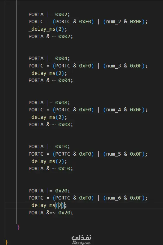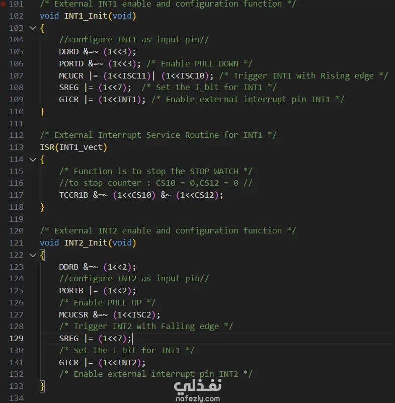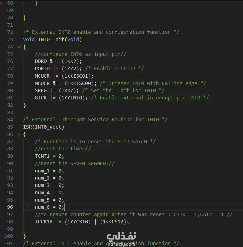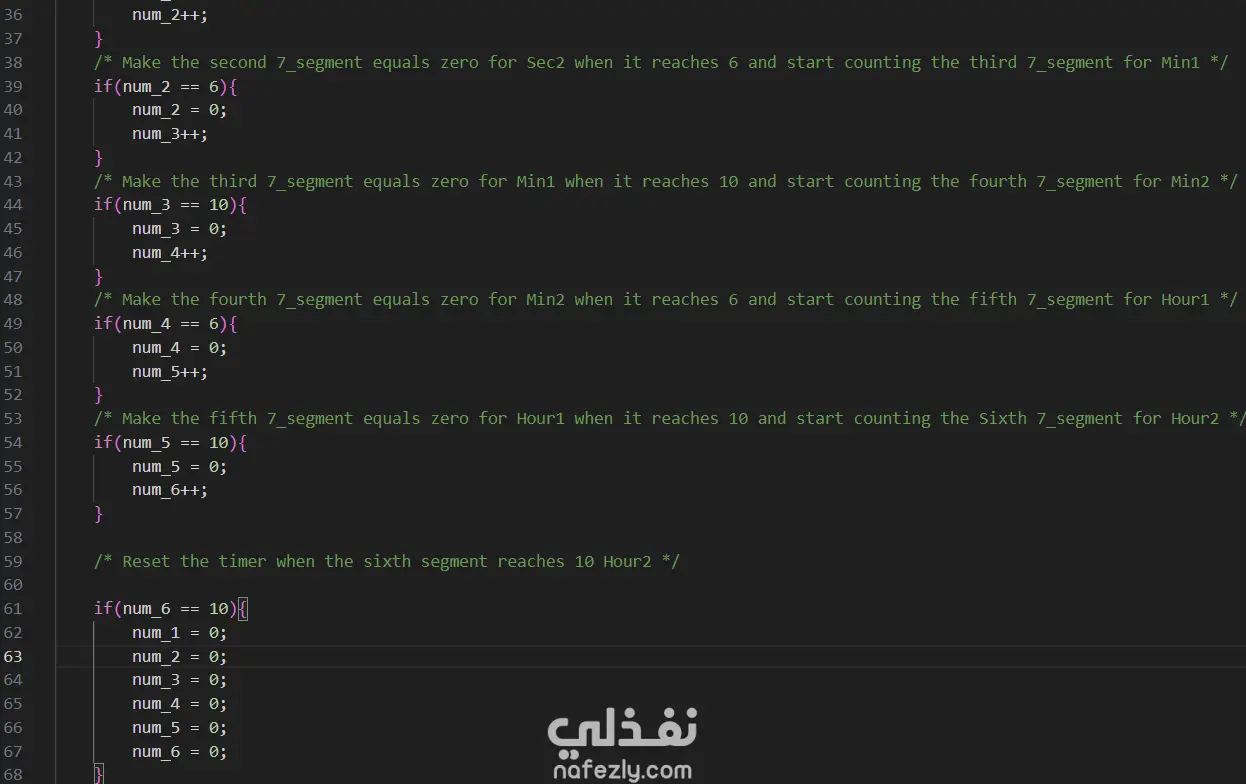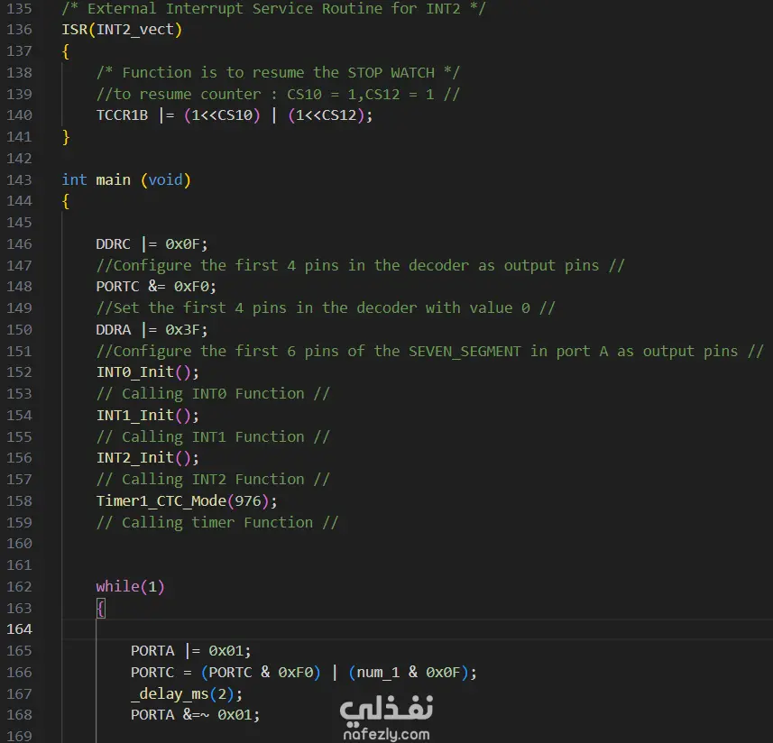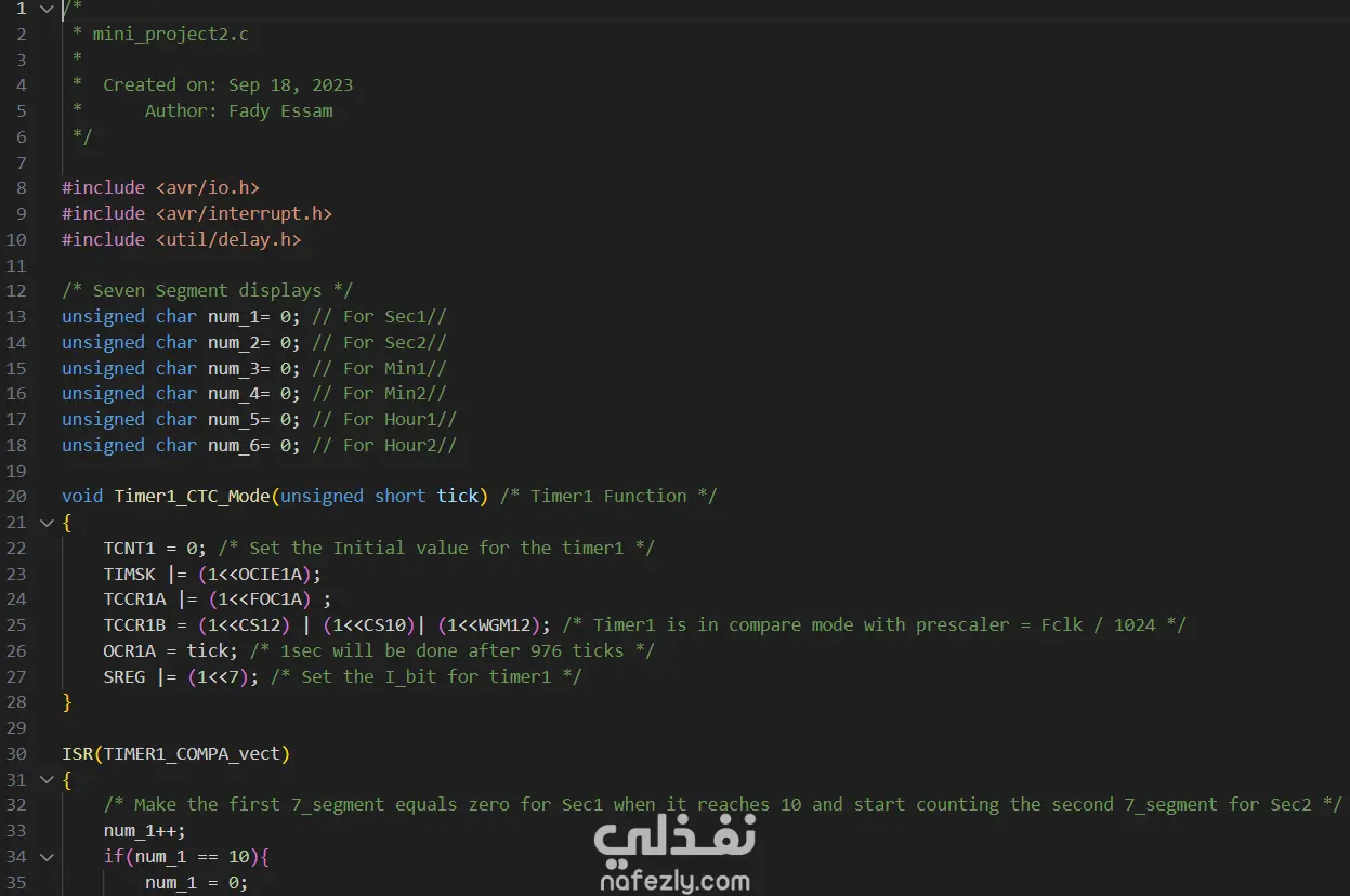 المشروع الثاني هو نظام ساعة توقيت (Stopwatch System) باستخدام الميكروكنترولر ATmega32. وفيما يلي ملخص مختصر لتفاصيل المشروع: فكرة المشروع: تصميم وتنفيذ ساعة توقيت إلكترونية تعتمد على الميكروكنترولر ATmega32 بتردد 1 ميجاهرتز، لعرض الوقت على ست شاشات 7-Segment باستخدام طريقة المضاعفة (Multiplexing). التفاصيل التقنية: استخدام Timer1 في وضع CTC Mode لحساب الوقت. توصيل ست شاشات 7-Segment Common Anode من خلال decoder 7447 واحد. التحكم في تشغيل كل شاشة باستخدام ترانزستورات NPN موصولة بأطراف من PORTA. ربط أطراف الـ Decoder بأول 4 أرجل من PORTC. التحكم في الساعة: يبدأ العد تلقائيًا عند توصيل الطاقة بالميكروكنترولر. زر Reset (INT0): عند الضغط (edge falling) يُعاد ضبط الوقت للصفر. زر Pause (INT1): عند الضغط (edge rising) تتوقف الساعة مؤقتًا. زر Resume (INT2): عند الضغط (edge falling) تستأنف الساعة العدّ من جديد.