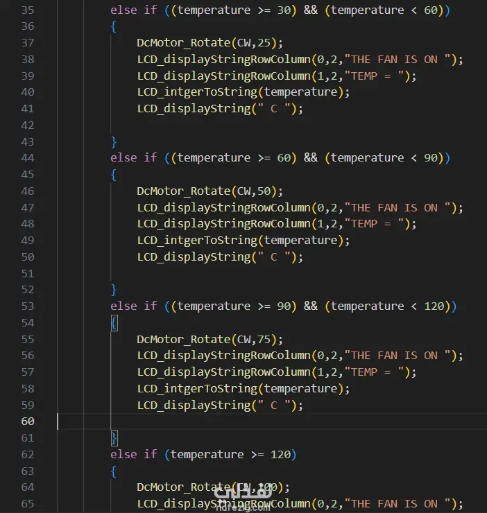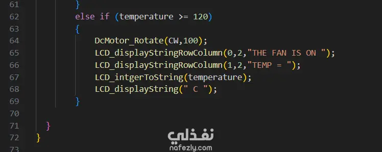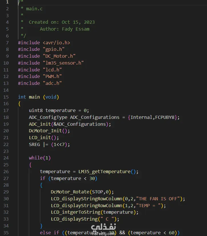 لمشروع الثالث هو نظام تحكم في المروحة (Fan Controller System) باستخدام الميكروكنترولر ATmega32. وفيما يلي ملخص مختصر لتفاصيل المشروع فكرة المشروع: تصميم نظام يتحكم تلقائيًا في تشغيل المروحة وسرعتها بناءً على درجة الحرارة المقاسة بواسطة حساس LM35. يتم عرض درجة الحرارة وحالة المروحة على شاشة LCD. تفاصيل التنفيذ: استخدام ATmega32 بتردد 1MHz. قراءة درجة الحرارة من الحساس LM35 عبر ADC Channel 2. عرض القيم على LCD متصلة بالمنافذ: RS → PD0 E → PD2 Data → PORTC التحكم في سرعة المروحة (DC Motor) باستخدام إشارة PWM من Timer0. منطق التحكم في المروحة: درجة الحرارة حالة المروحة السرعة أقل من 30°C إيقاف 0% ≥ 30°C تشغيل 25% ≥ 60°C تشغيل 50% ≥ 90°C تشغيل 75% ≥ 120°C تشغيل 100% المكونات البرمجية: ADC Driver: لتحويل القيم التناظرية من LM35 إلى رقمية. PWM Driver: لتوليد إشارة تحكم بسرعة المروحة. DC Motor Driver: لتدوير المحرك في الاتجاه المطلوب أو إيقافه. LCD Driver: لعرض البيانات على الشاشة. Temperature Sensor Driver: لتحويل خرج الحساس إلى درجة حرارة فعلية.