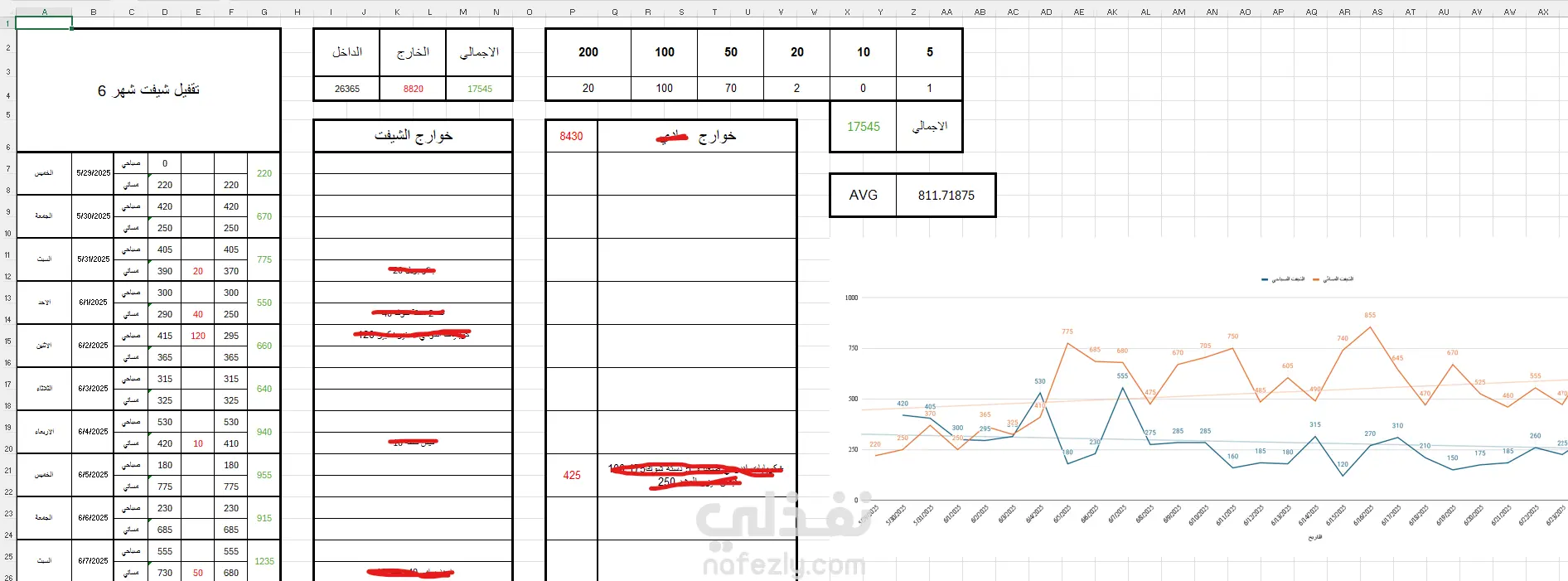 ملف عملي قمت بإعداده لتقفيل حسابات شهرية لمحل مبيعات، يتضمن تنظيم الإيرادات والمصروفات وتحليل الأداء الشهري بشكل دقيق ومنسق.