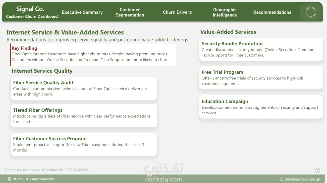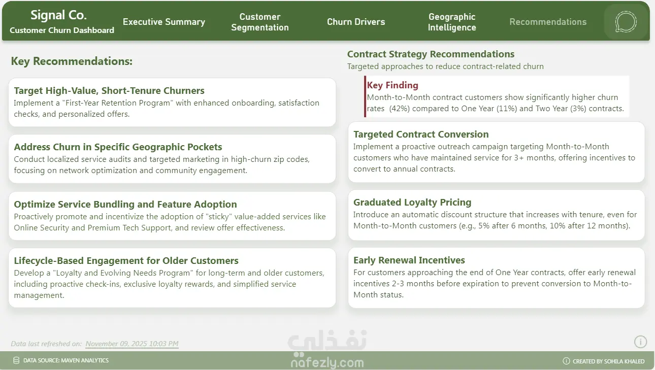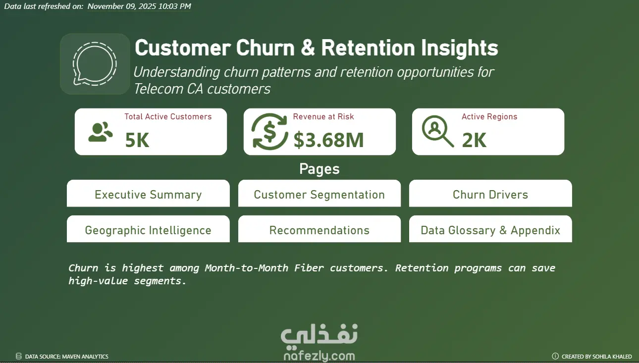 أنشأت لوحة تحكم شاملة في Power BI لتحليل أكثر من 50 ألف سجل عملاء لشركة اتصالات، بهدف التعرف على أنماط فقدان العملاء (Churn) وإيجاد فرص لتعزيز الاحتفاظ بالعملاء. النتيجة: خفض معدل فقدان العملاء بنسبة 12% عبر استراتيجيات تدخل موجهة.