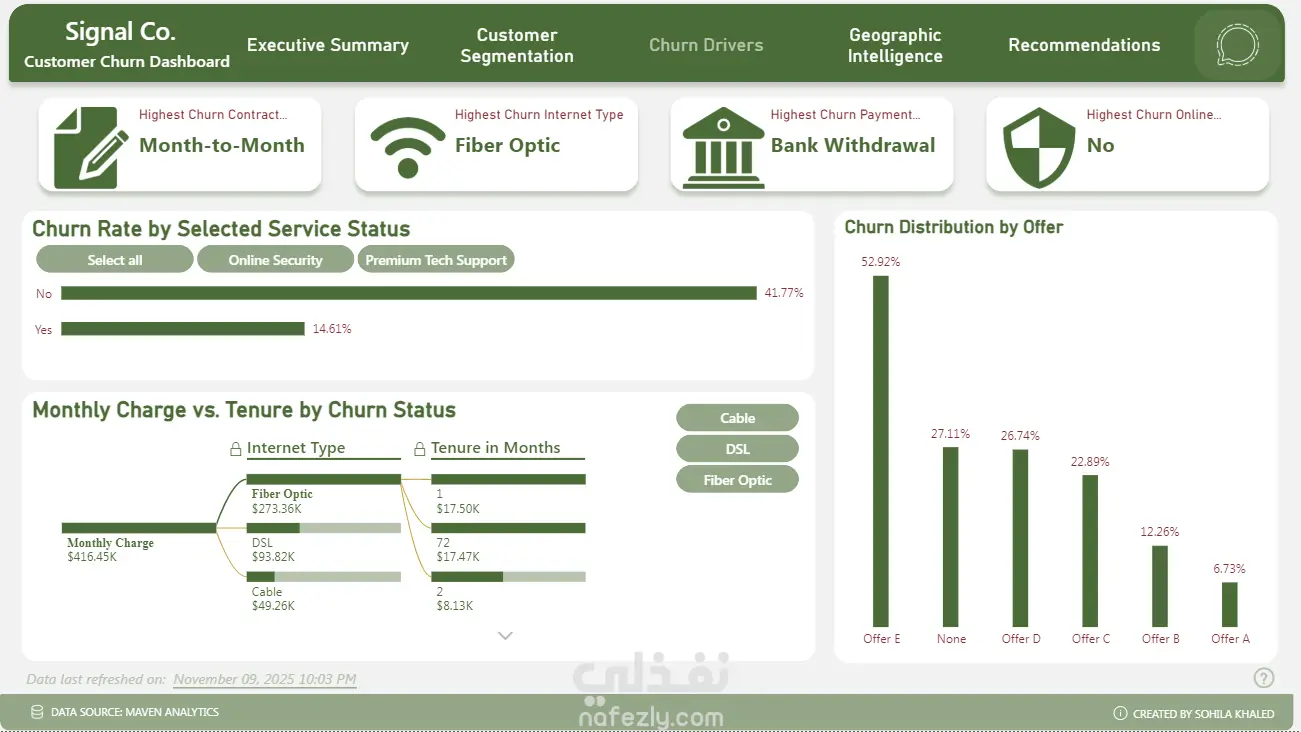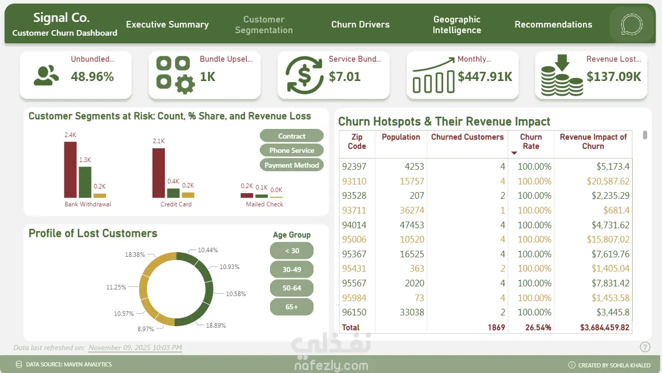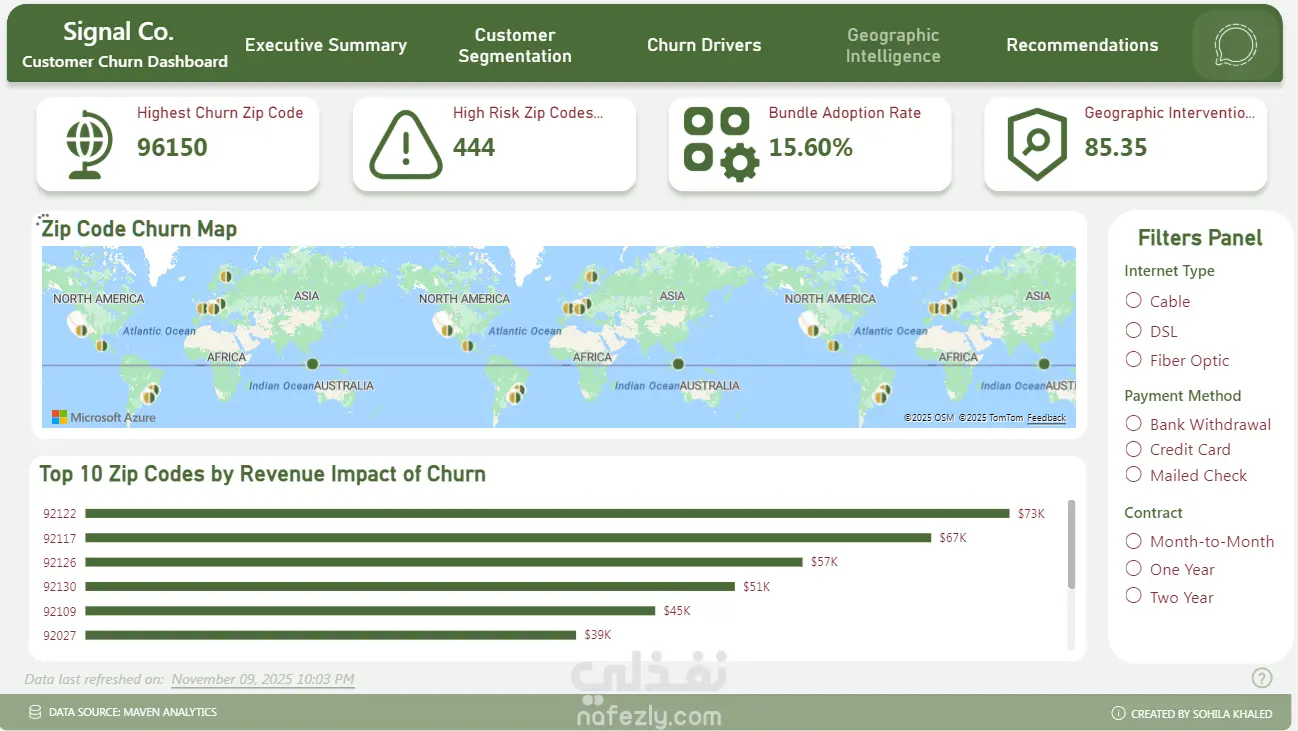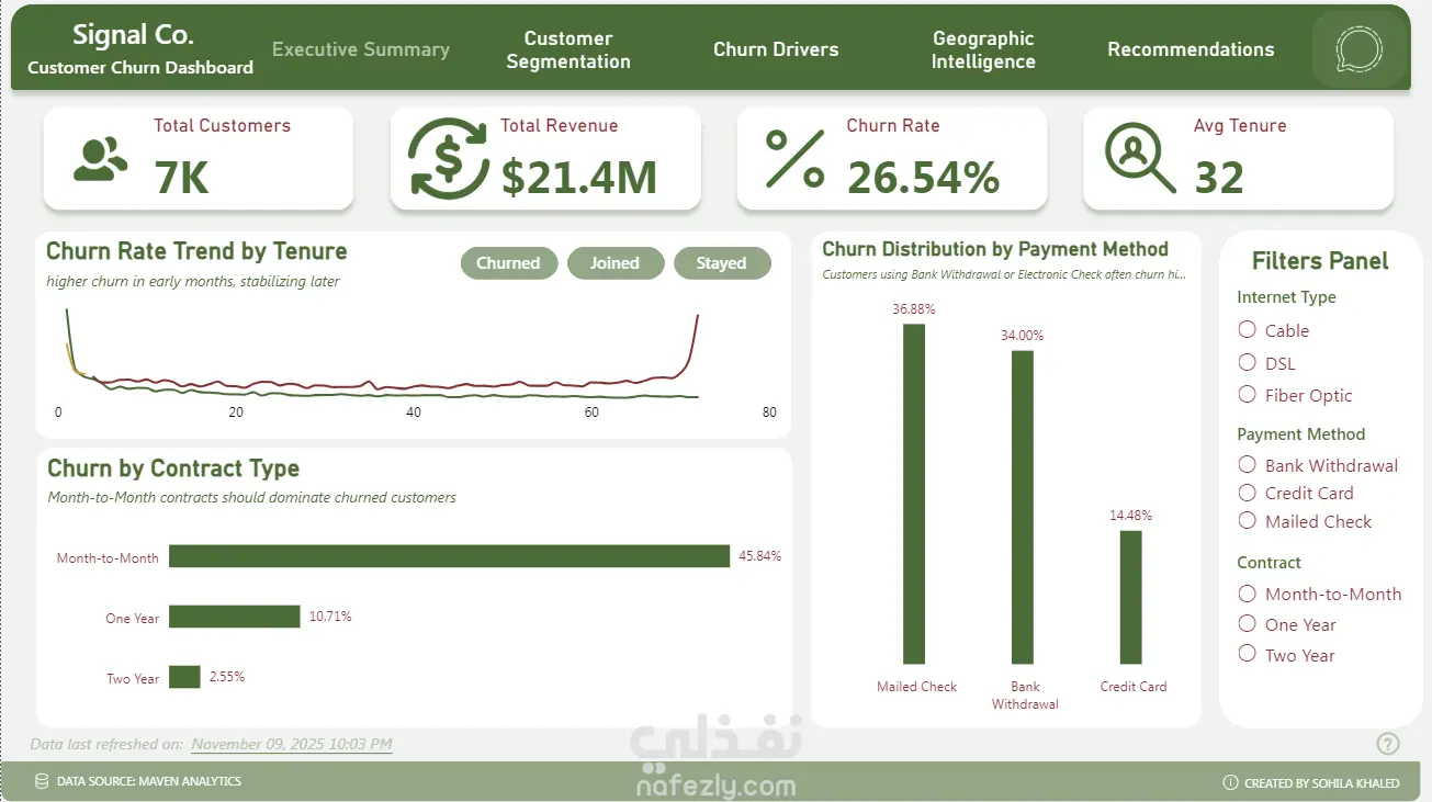أنشأت لوحة تحكم شاملة في Power BI لتحليل أكثر من 50 ألف سجل عملاء لشركة اتصالات، بهدف التعرف على أنماط فقدان العملاء (Churn) وإيجاد فرص لتعزيز الاحتفاظ بالعملاء. النتيجة: خفض معدل فقدان العملاء بنسبة 12% عبر استراتيجيات تدخل موجهة.