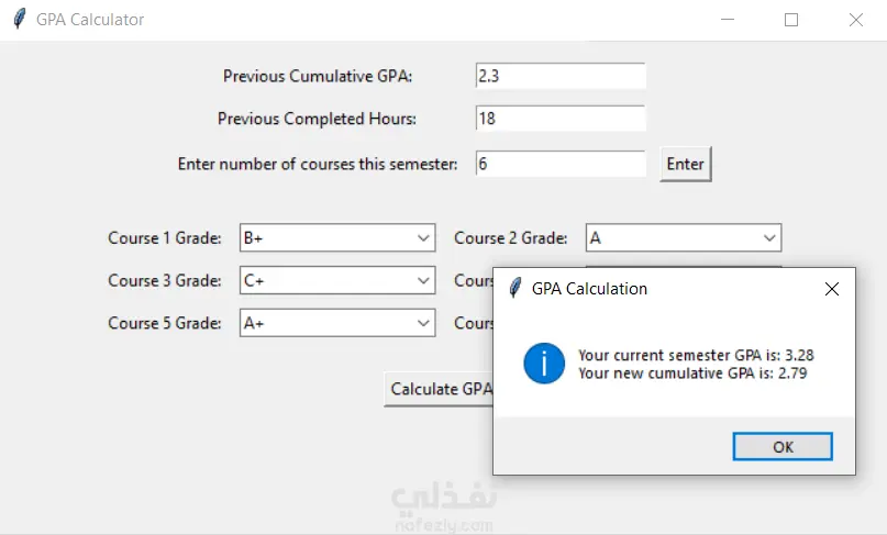 قمت بتطوير تطبيق بسيط وسهل الاستخدام لحساب المعدل التراكمي (GPA) للطلاب باستخدام لغة Python وواجهة Tkinter.