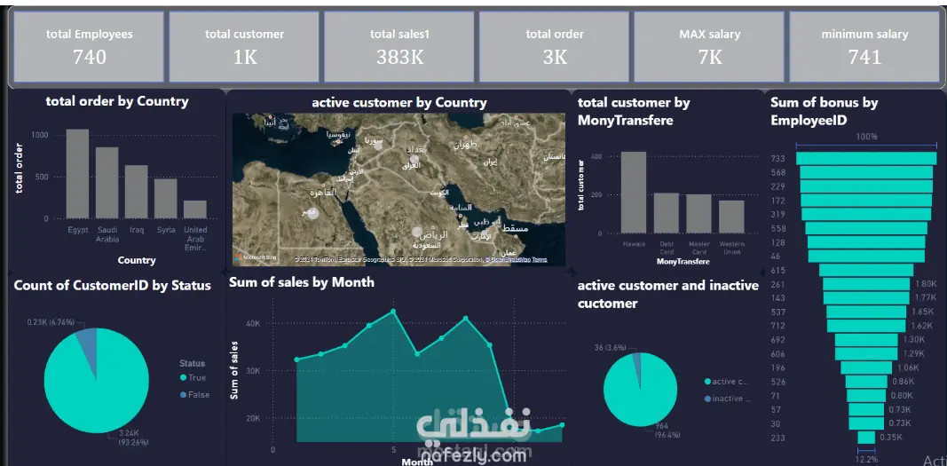 تصميم وتطوير لوحة تحكم تفاعلية تجمع بين تحليل الأداء التشغيلي (المبيعات والطلبات) ومقاييس الموارد البشرية الأساسية (الرواتب والمكافآت)، مع تحليل مفصل للعملاء وتوزيعهم الجغرافي.