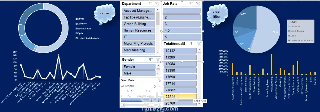 تطوير وحدة تحليل ديناميكية ومتعددة الأبعاد تتيح للمستخدمين استكشاف البيانات الوظيفية للمؤسسة، والتحليل الدقيق للرواتب السنوية الإجمالية، وتوزيع الموظفين حسب القسم والبلد، من خلال أدوات تصفية تفاعلية.
