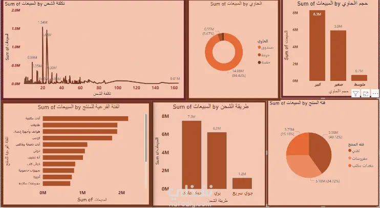 تصميم وتطوير لوحة تحكم تفاعلية متخصصة في تحليل أداء سلسلة التوريد والشحن، وربطها مباشرة بالمبيعات. الهدف هو توفير رؤى حول تكاليف وكثافة الشحن، وطرق الشحن الأكثر استخداماً، وتأثير ذلك على فئات المنتجات المختلفة.