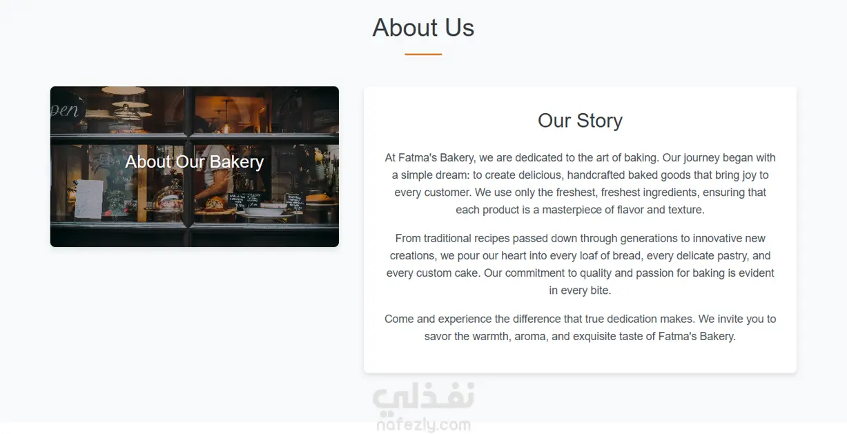 موقع My Bakery هو موقع تعريفي بسيط وجذاب لمخبز يقدم مجموعة متنوعة من المخبوزات والحلويات الطازجة مثل الكعك، الكرواسون، والخبز البلدي. يهدف الموقع إلى عرض منتجات المخبز بطريقة أنيقة وسهلة التصفح، مع تصميم يعكس دفء المخبوزات وجودتها. يتكون الموقع من عدة أقسام تشمل الصفحة الرئيسية التي تحتوي على ترحيب وصورة جذابة، قسم "من نحن" الذي يعرّف بالمخبز وقصته، قسم "منتجاتنا" الذي يعرض المخبوزات مع صور ووصف بسيط لكل منتج، بالإضافة إلى قسم "آراء العملاء" و"تواصل معنا" الذي يتيح للزوار إرسال الرسائل ومعرفة موقع المخبز ووسائل التواصل الاجتماعي. تم بناء الموقع باستخدام HTML، CSS، وJavaScript مع اعتماد تصميم متجاوب (Responsive) يعمل بسلاسة على جميع الأجهزة. يتميز الموقع بألوان دافئة وخطوط مريحة للعين تعكس الطابع الهادئ والودي للمخبز.