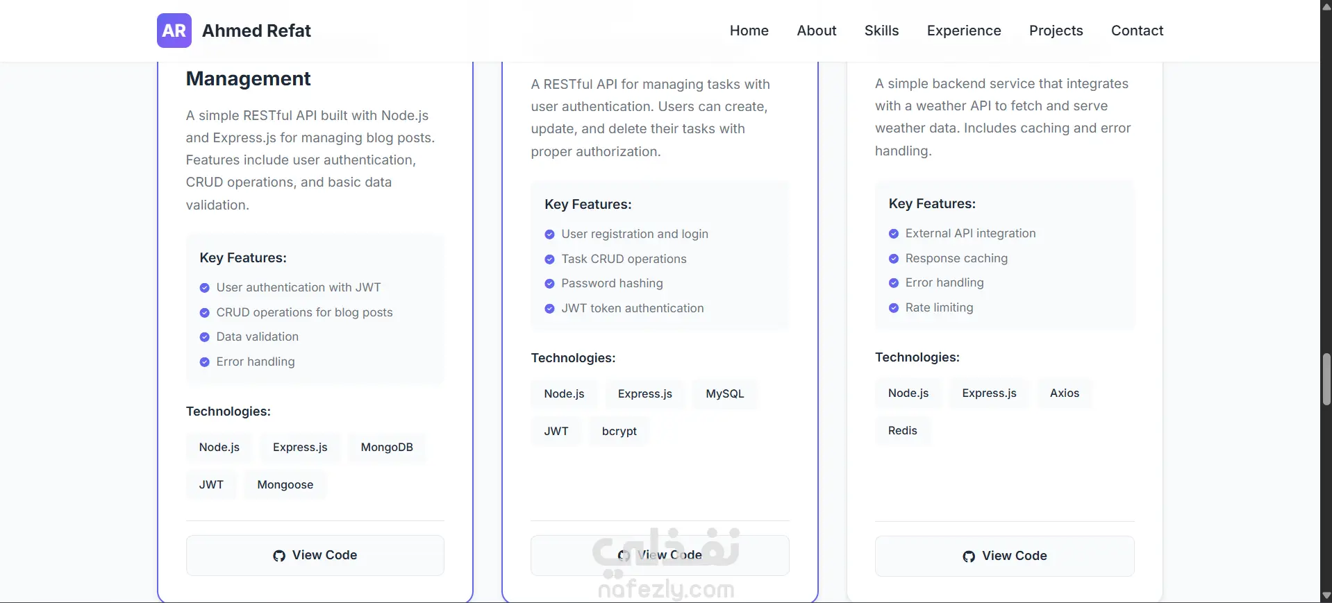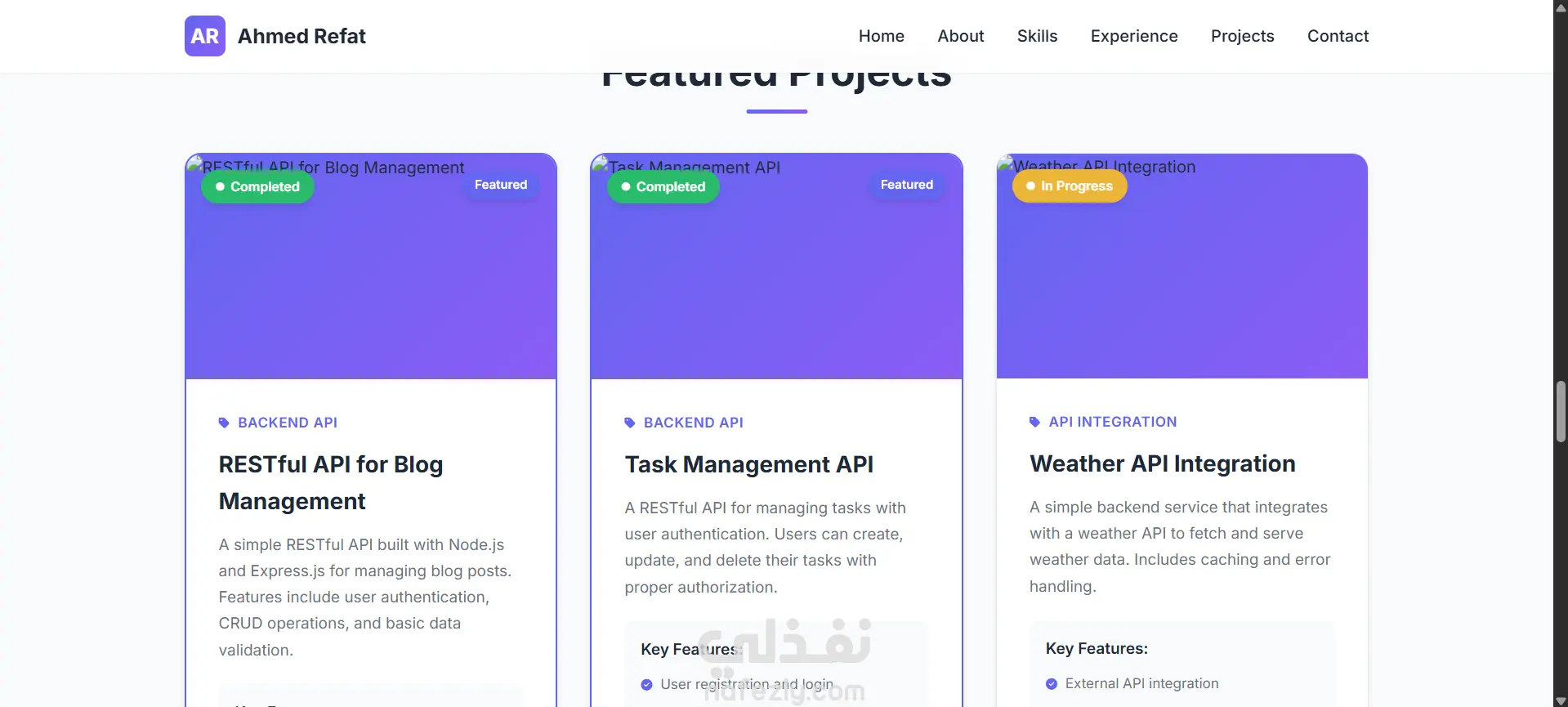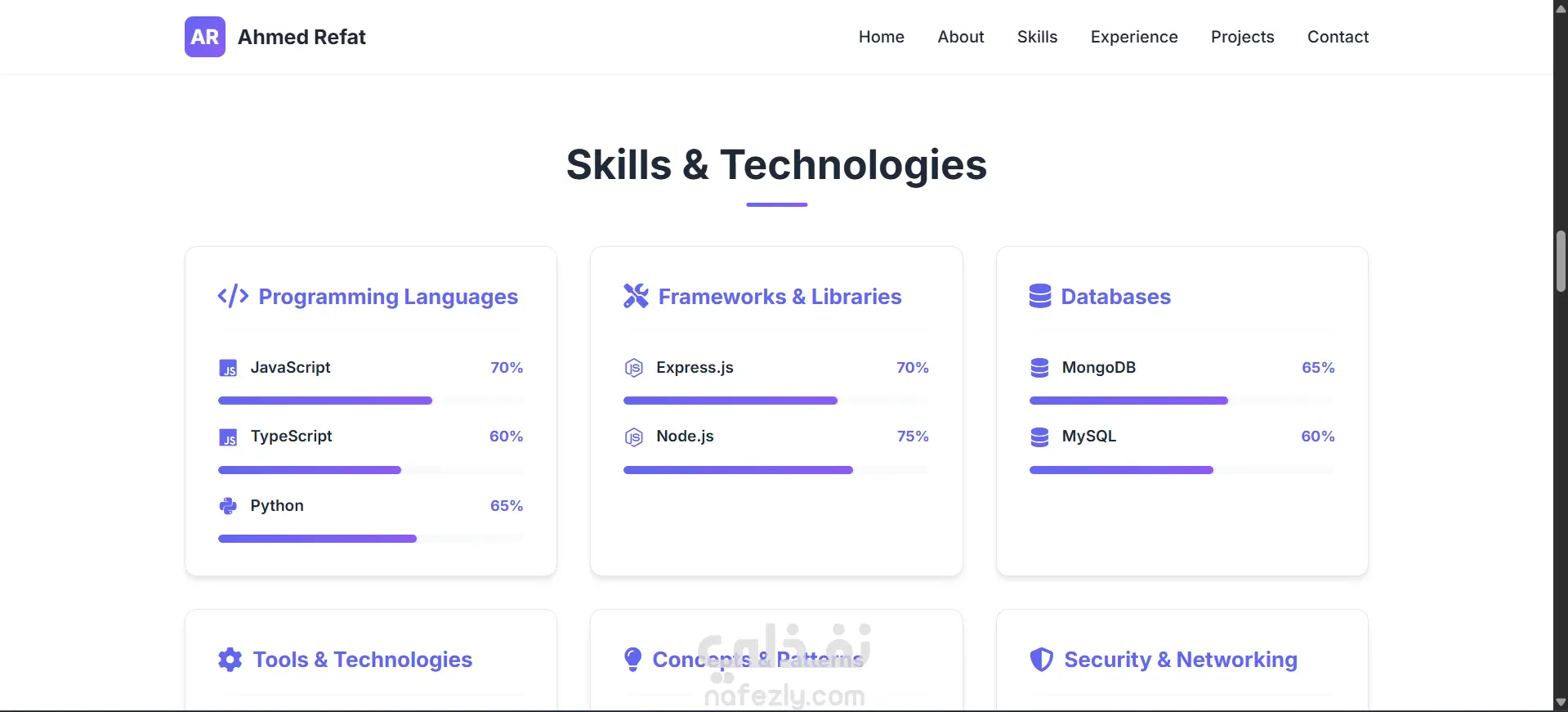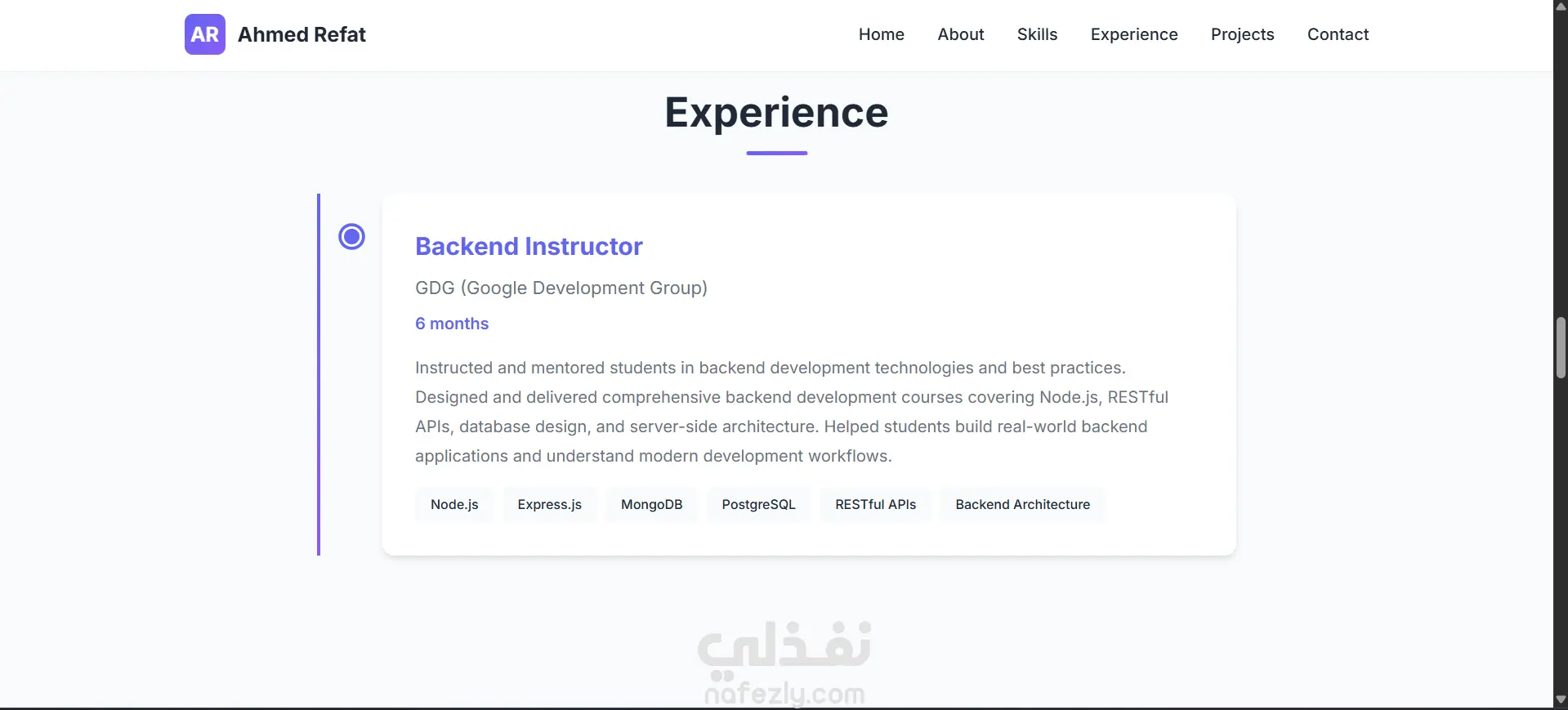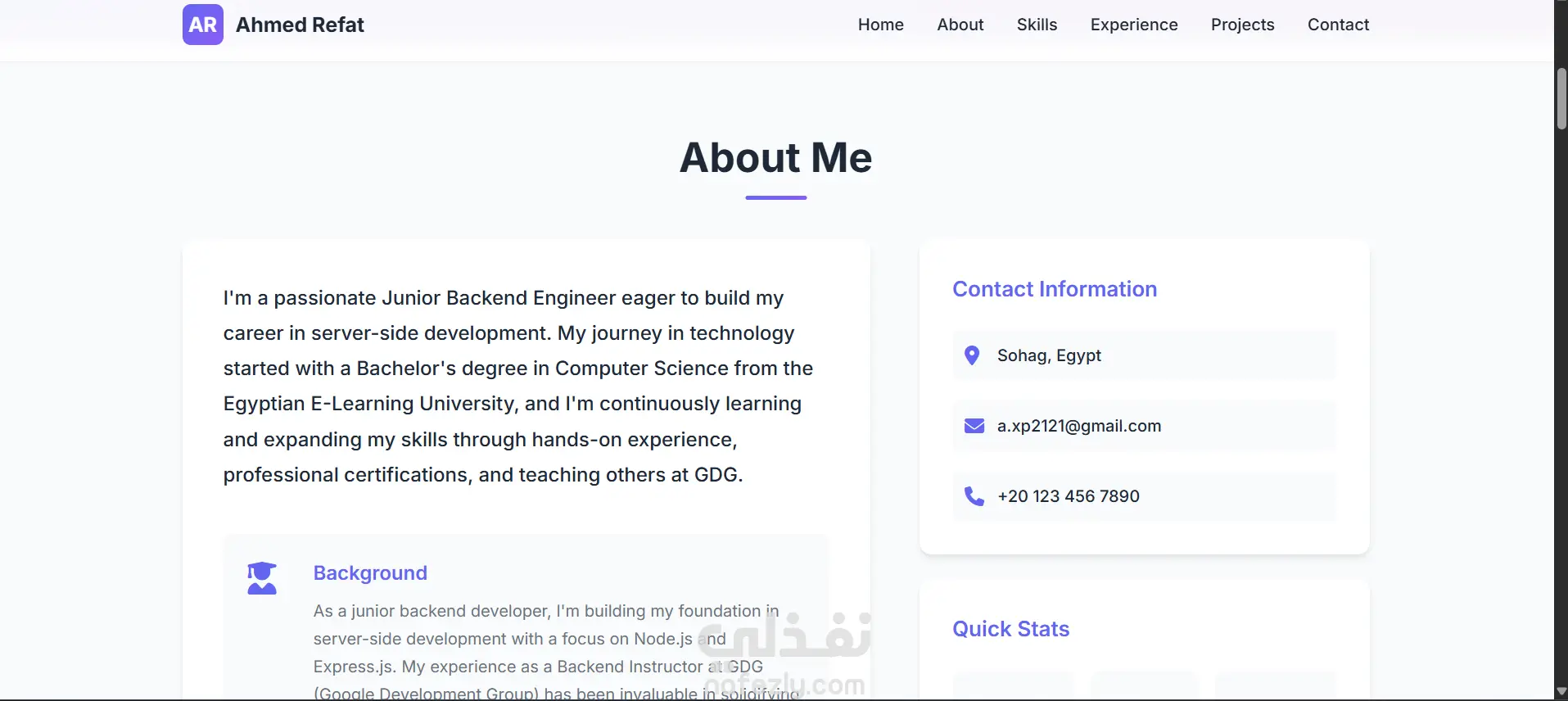 هذا المشروع عبارة عن موقع بورتفوليو احترافي قمت بتطويره باستخدام HTML، CSS، وJavaScript لعرض معلومات أحد العملاء بطريقة منظمة وجذابة. يهدف الموقع إلى إبراز هوية العميل ومهاراته ومشاريعه بشكل احترافي ومتجاوب مع جميع الأجهزة. يتكوّن الموقع من عدة أقسام متكاملة تشمل: الصفحة الرئيسية: تحتوي على اسم العميل، صورته، ونبذة تعريفية قصيرة عنه. قسم "About Me": يعرض الخلفية التعليمية، الشغف، التخصص، والأهداف المهنية. قسم "Skills & Technologies": يعرض المهارات والتقنيات التي يتقنها العميل. قسم "Experience": يحتوي على جدول زمني يعرض الخبرات العملية. قسم "Projects": يضم مجموعة من المشاريع المميزة مع عرض بسيط لها. قسم "Education & Certifications": يوضح الشهادات والمسيرة التعليمية. قسم "Contact": يتيح التواصل المباشر عبر البريد الإلكتروني أو الهاتف. تم بناء الموقع بتصميم متجاوب يعمل بسلاسة على مختلف الأجهزة (كمبيوتر، تابلت، موبايل) مع واجهة عصرية وخفيفة. كما تم كتابة الكود بأسلوب منظم وسهل التعديل مستقبلًا، مع استخدام JavaScript لتوليد البيانات ديناميكيًا وتحسين التفاعل بين الأقسام.