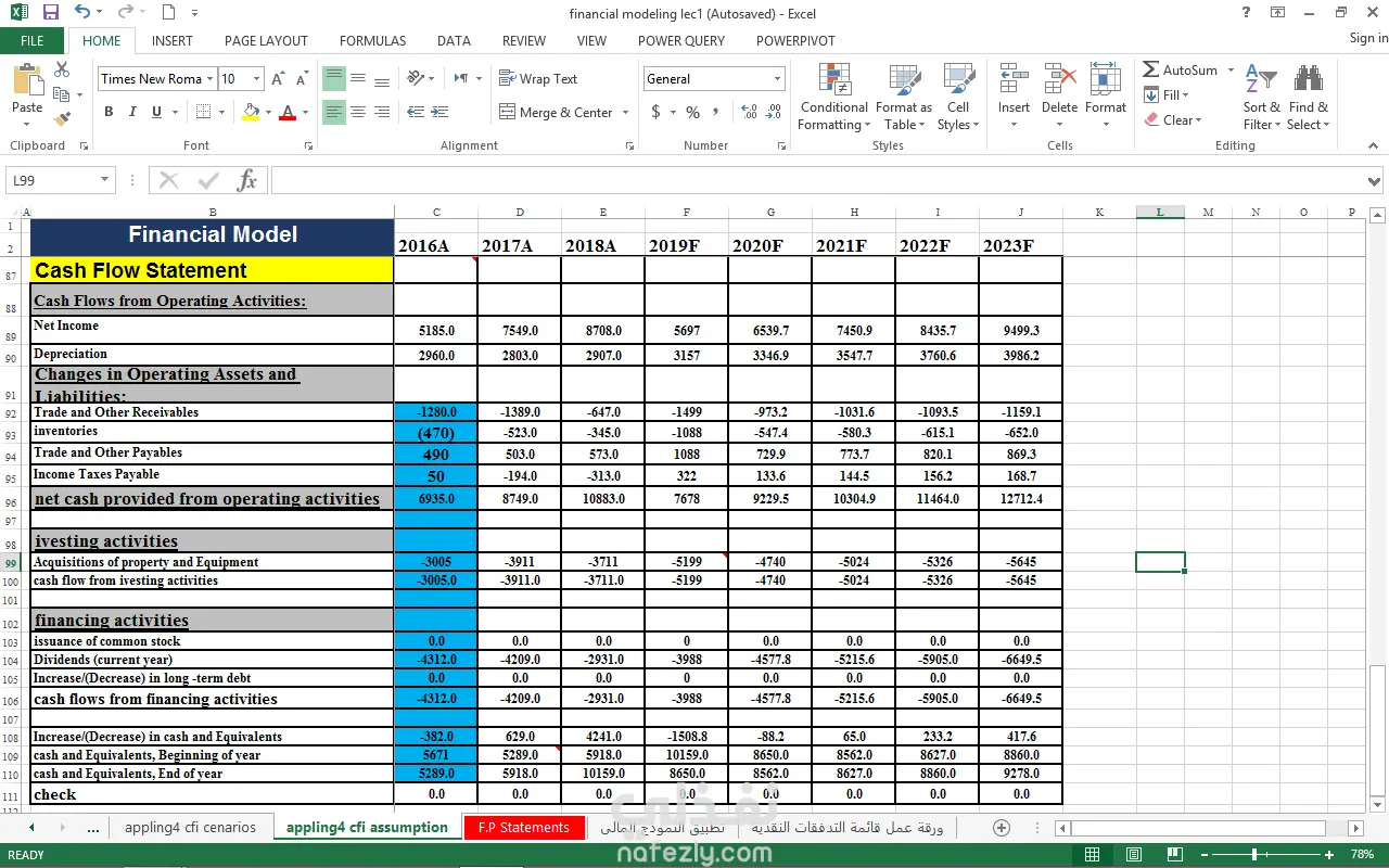 عمل نماذج لتوقع القوائم المالية الميزانية وقائمة الدخل وقائمة التدفقات النقدية لمدة خمس سنوات لبنود القوائم المالية