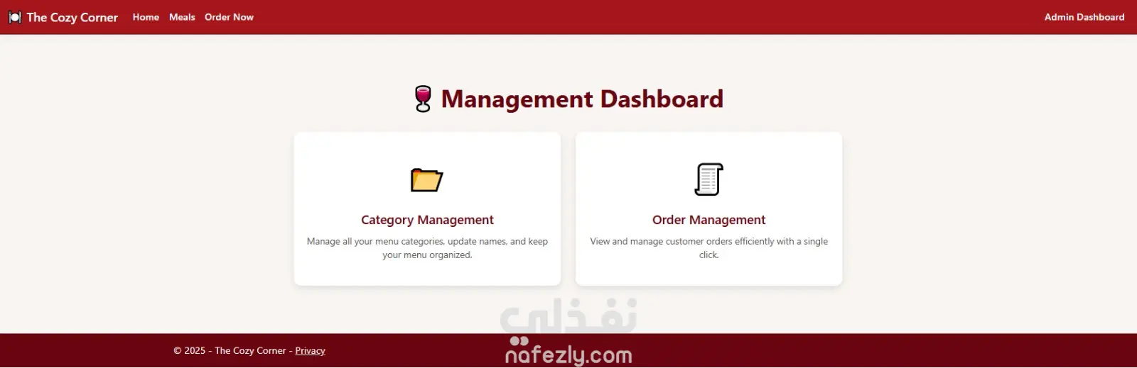 قمت بتطوير تطبيق ويب يتيح إدارة المطعم من جانب المستخدم والإدمن، ويهدف إلى تسهيل عملية الطلبات وإدارتها. المهام والوظائف الرئيسية: إدارة التصنيفات (Category Management) وتنفيذ عمليات CRUD كاملة. إدارة الطلبات (Order Management) من حيث تتبع الحالة، وقيمة الطلب، وتاريخ الإنشاء. تصميم واجهة سهلة الاستخدام لكل من العميل والإدمن. الاعتماد على MVC Architecture لتقسيم المشروع وتنظيمه بشكل احترافي.