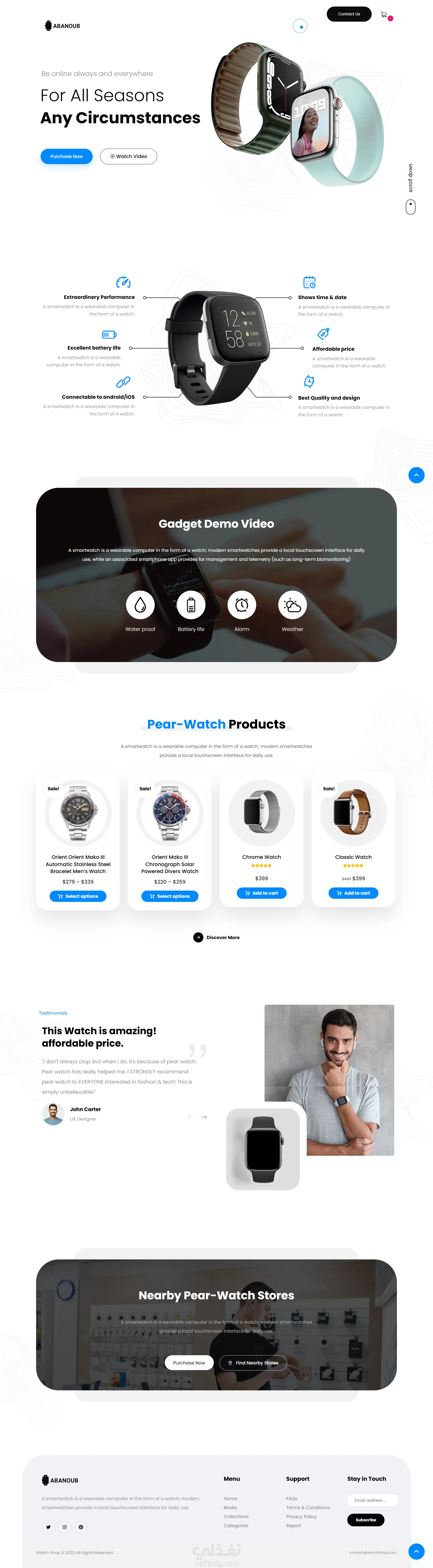 موقع تجاري حديث وجذاب لعرض وبيع الساعات الذكية (Smartwatch) يتضمن: - صفحة رئيسية بتصميم عصري مع عرض المنتجات بشكل احترافي - قسم تفصيلي لمواصفات وميزات الساعات مع أيقونات توضيحية - معرض منتجات شامل مع الأسعار وأزرار الشراء - قسم فيديو تعريفي بالمنتجات - قسم آراء العملاء والتقييمات - خريطة لعرض مواقع المتاجر القريبة - تصميم متجاوب بالكامل مع جميع الأجهزة (موبايل - تابلت - حاسوب) - واجهة مستخدم سلسة وسهلة الاستخدام - تكامل مع أنظمة الدفع الإلكتروني