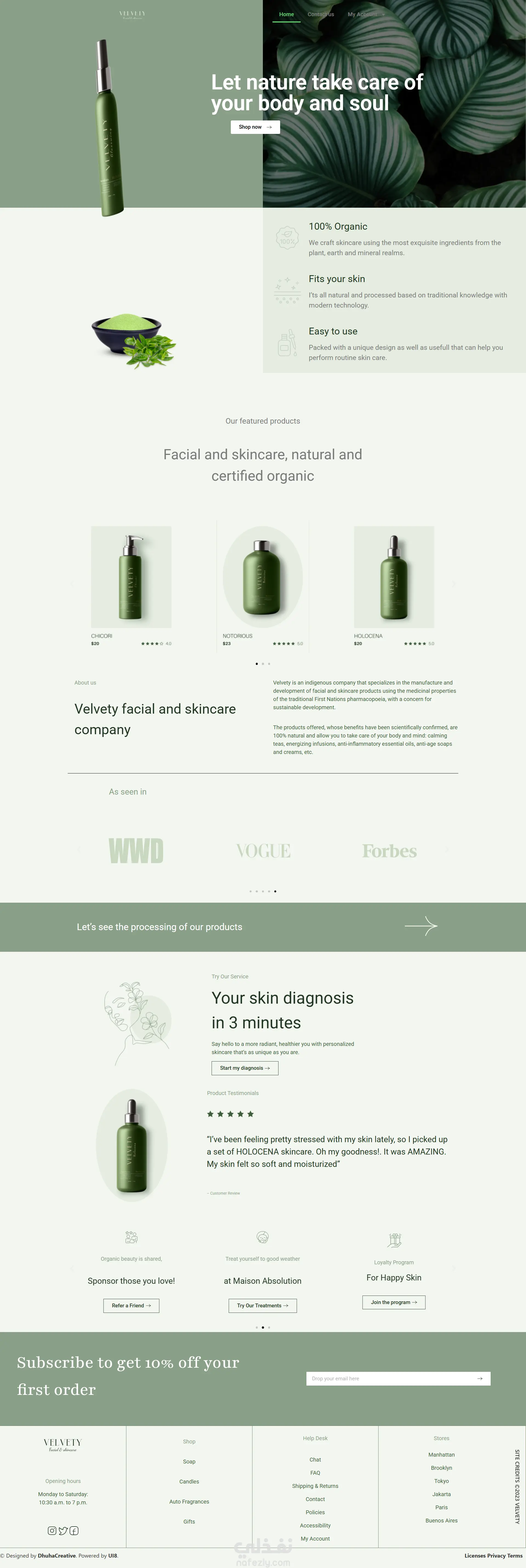 -موقع "Velvety" يقدم تجربة أنيقة وطبيعية لعناية البشرة، بتصميم عصري وألوان خضراء وبيضاء تعكس الطابع العضوي - الستايل العام: تصميم نظيف وحديث، يعتمد على تباين الألوان الأخضر والأبيض لإبراز الطابع العضوي. استخدام جيد للمساحات البيضاء يمنح راحة بصرية. -الهيكل: هيرو، تعريف بالعلامة، منتجات، ميزة تشخيص البشرة، اشتراك، وفوتر. -الهوية البصرية: استخدام صور عالية الجودة للمنتجات، مع تصنيف نجوم واضح، يعزز الثقة ويحفز الشراء.