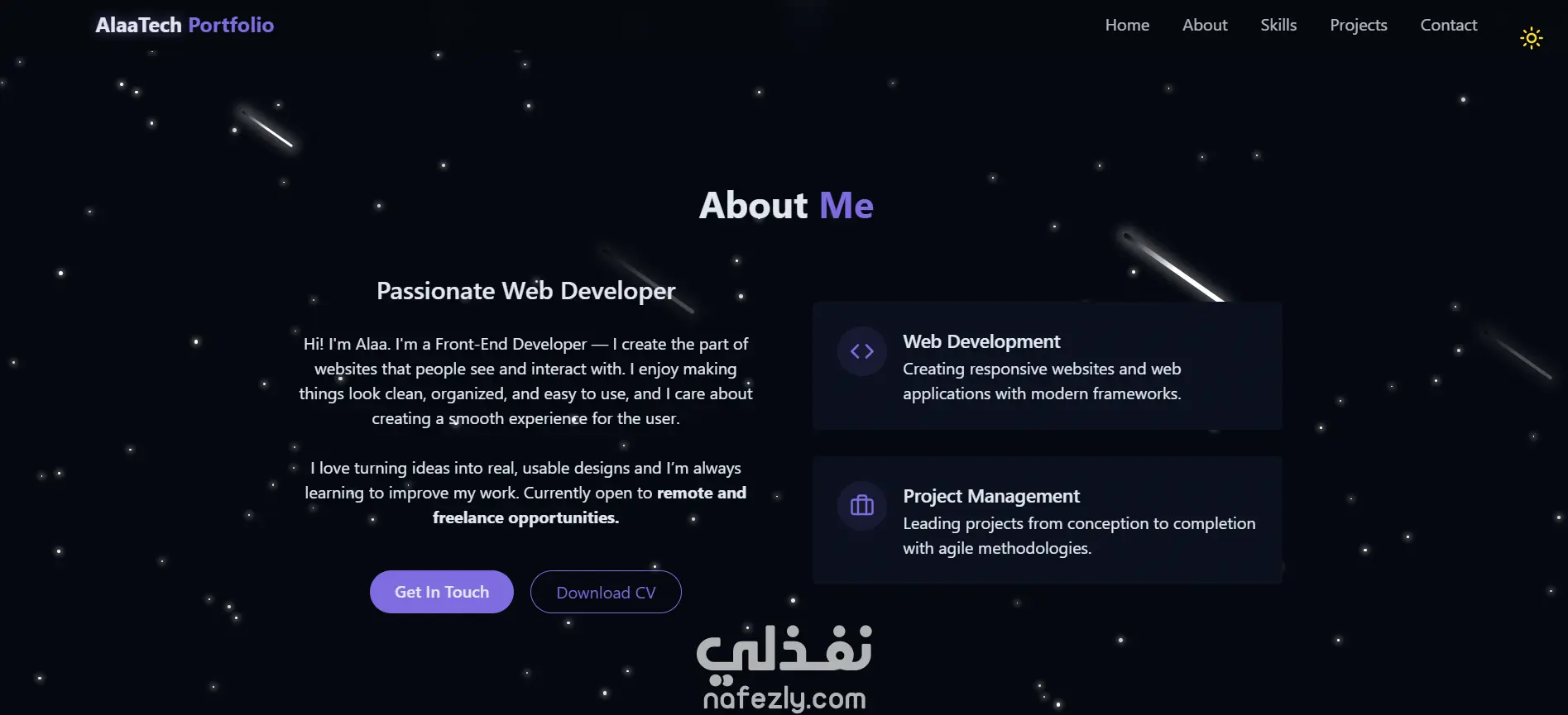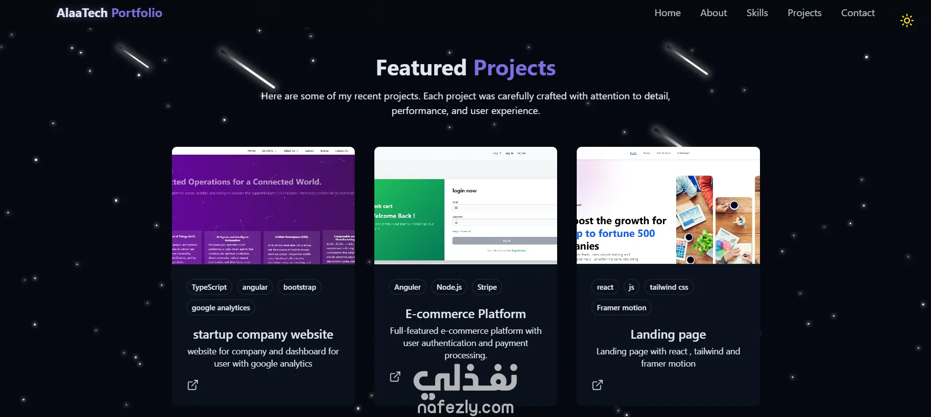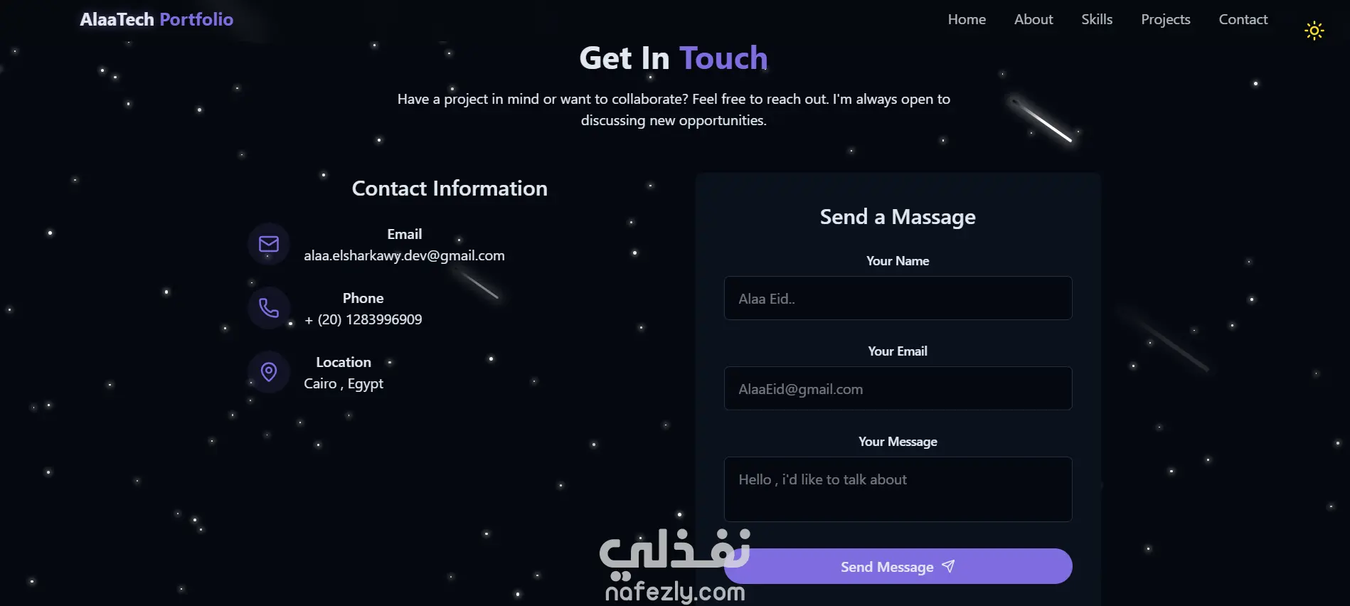 طورت موقعًا شخصيًاportfolio لعرض مهاراتي كمطورة فرونت إند باستخدام React وTailwind CSS، مع نشره على Vercel لضمان أداء سريع ومتجاوب. يتضمن أقسامًا لنبذة عني، قائمة المهارات (HTML، CSS، JavaScript، React، Angular، TypeScript، Bootstrap)، عرض المشاريع السابقة (مثل موقع الشركة الناشئة والمتجر الإلكتروني)، وقسم تواصل تفاعلي يتيح للزوار الاتصال بي مباشرة عبر نموذج مدمج. ركزت على تجربة مستخدم سلسة مع أنيميشن خفيفة وتصميم متجاوب، مما يعكس قدرتي على بناء مواقع احترافية من الصفر