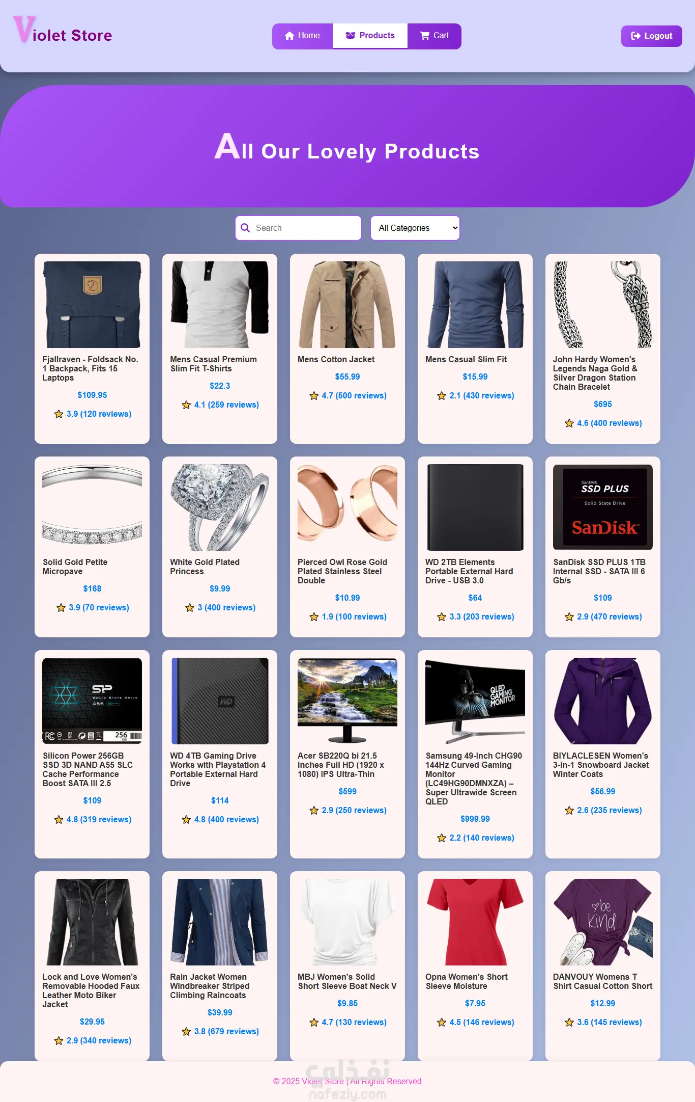 قمت بتصميم وتطوير صفحة منتجات احترافية لمتجر إلكتروني باسم Violet Store باستخدام HTML و CSS و JavaScript، بتصميم عصري وسهل الاستخدام يعرض المنتجات بشكل منظم وواضح.