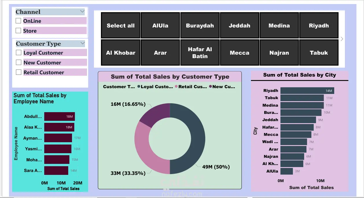 عمل تحليل تفصيلي لبيانات المبيعات ببرنامج power bi فى داينامك داشبورد على مستوى المناطق البيعيةونوع العملاء و المنتجات وتحليل البيانات تفصيليا للتصنيفات السابقة