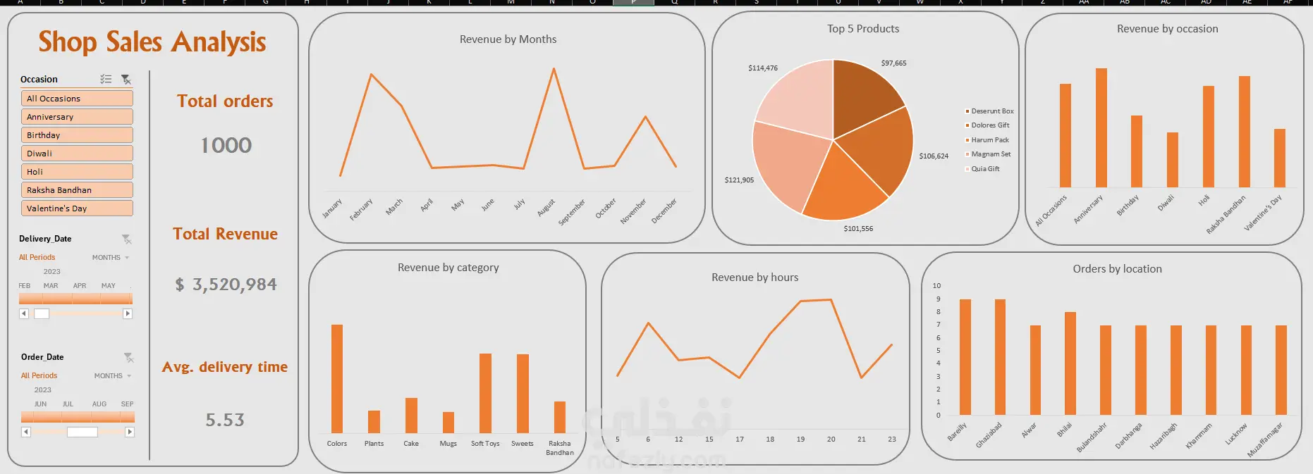 Shop Sales Analysis Dashboard تم إنشاء داشبورد لتتبع المبيعات والإيرادات وأداء التوصيل. يعرض أفضل المنتجات والفئات والمناسبات. يمكن التصفية حسب التاريخ والموقع. مرئيات واضحة للحصول على رؤى سريعة للأعمال.