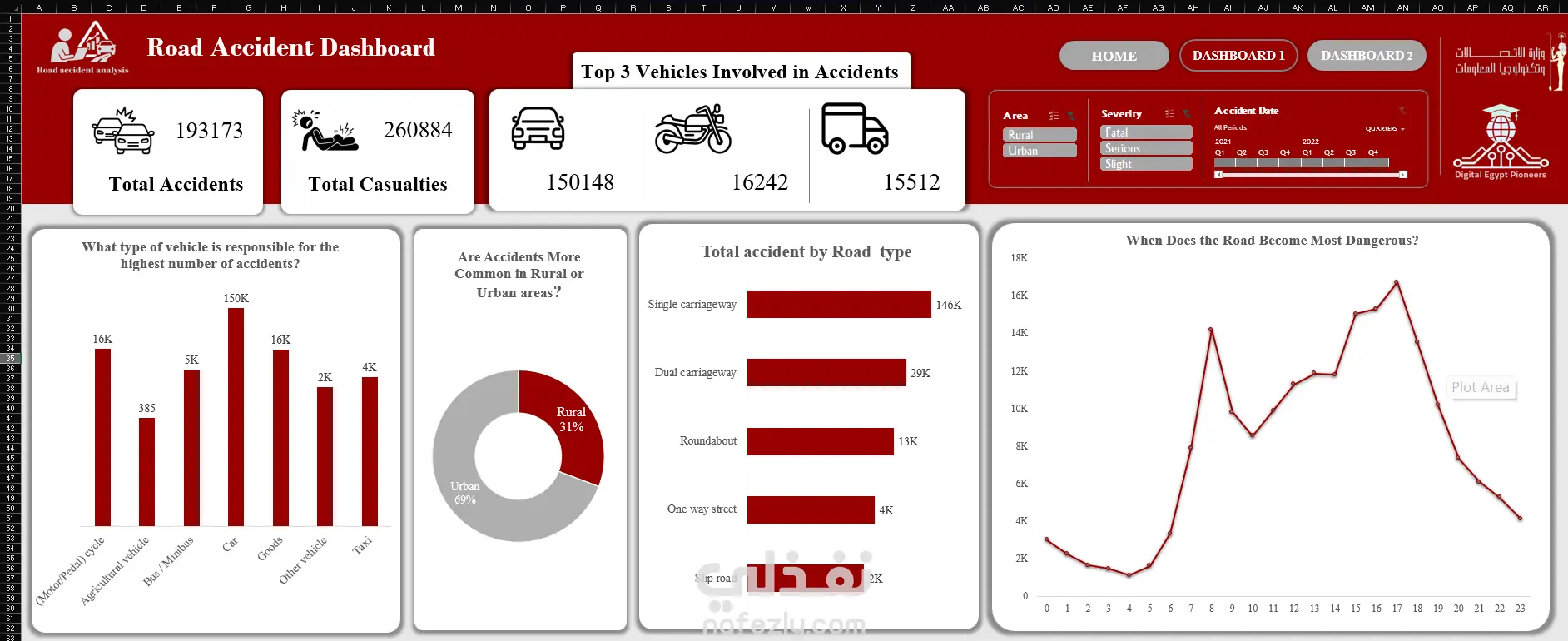 تم تصميم داشبورد تفاعلي لتحليل بيانات حوادث الطرق وكشف الرؤى المهمة. صورت الحوادث حسب السنة والشهر والساعة لاكتشاف الأنماط الزمنية. حللت الحوادث حسب ظروف الطقس وسطح الطريق لتحديد عوامل الخطر الرئيسية. صنفت الحوادث حسب شدتها ونوع المركبة. تم ادراج مؤشرات أداء رئيسية (KPIs) ومرشحات تفاعلية لاستكشاف البيانات بسرعة ووضوح.